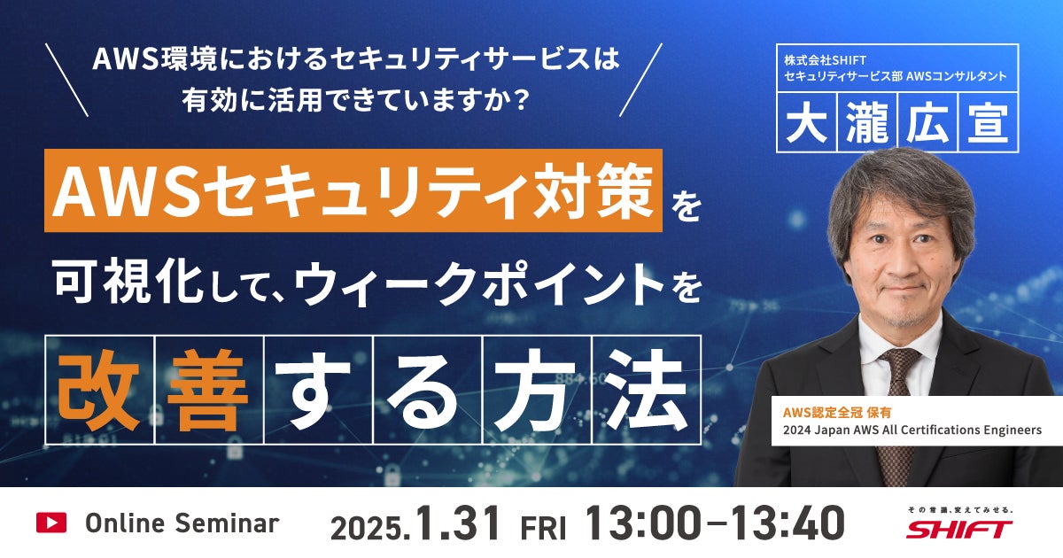 お客様の売れるソフトウェアサービス/製品づくりを支援する株式会社SHIFT(本社:東京都港区、代表取締役社長:丹下 大、プライム市場:3697、以下SHIFT)は、AWSセキュリティ対策の現状把握・可視化の方法について、AWS認定資格全冠を保有し、2024 Japan AWS All Certifications Engineersに選出されたスペシャリストが解説するセミナー「AWSセキュリティ対策を可視化して、ウィークポイントを改善する方法」を開催します。
