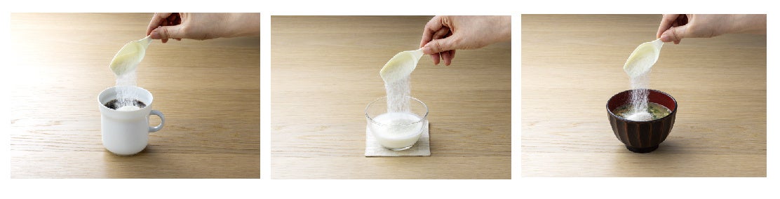 コラゲネイドは、溶けやすいため、普段の食事に簡単に取り入れられます。お好きなお料理やお飲み物に溶かしてお召し上がりください。