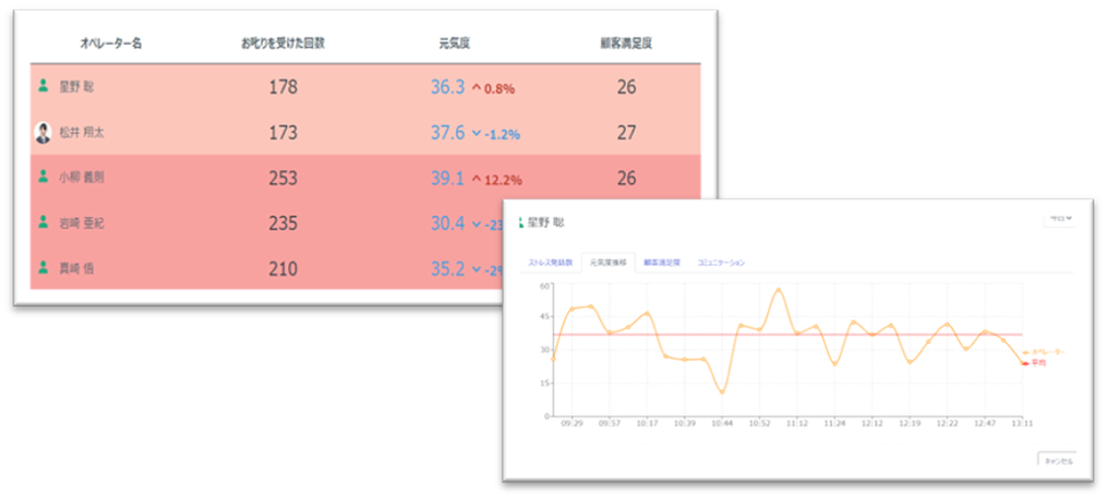 感情解析によりオペレータの元気度や顧客からの怒声を浴びた回数をカウントし、ケアが必要なオペレータについてダッシュボード上ですぐに分かるようになっています。