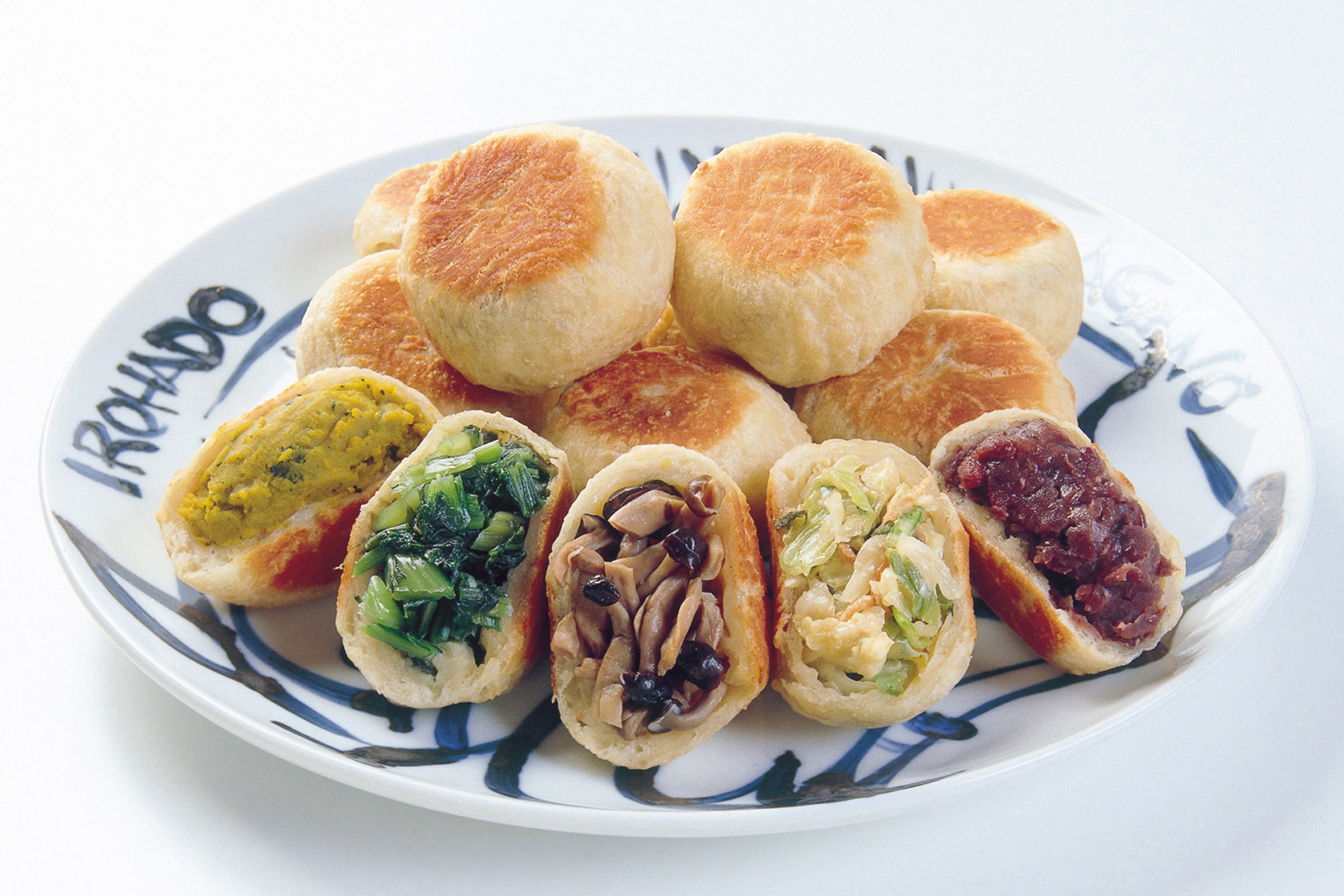 炉ばたのおやき各種(かぼちゃ・野沢菜・ぶなしめじ・野菜ミックス・粒あん・切干大根・ねぎみそ、1個)270円