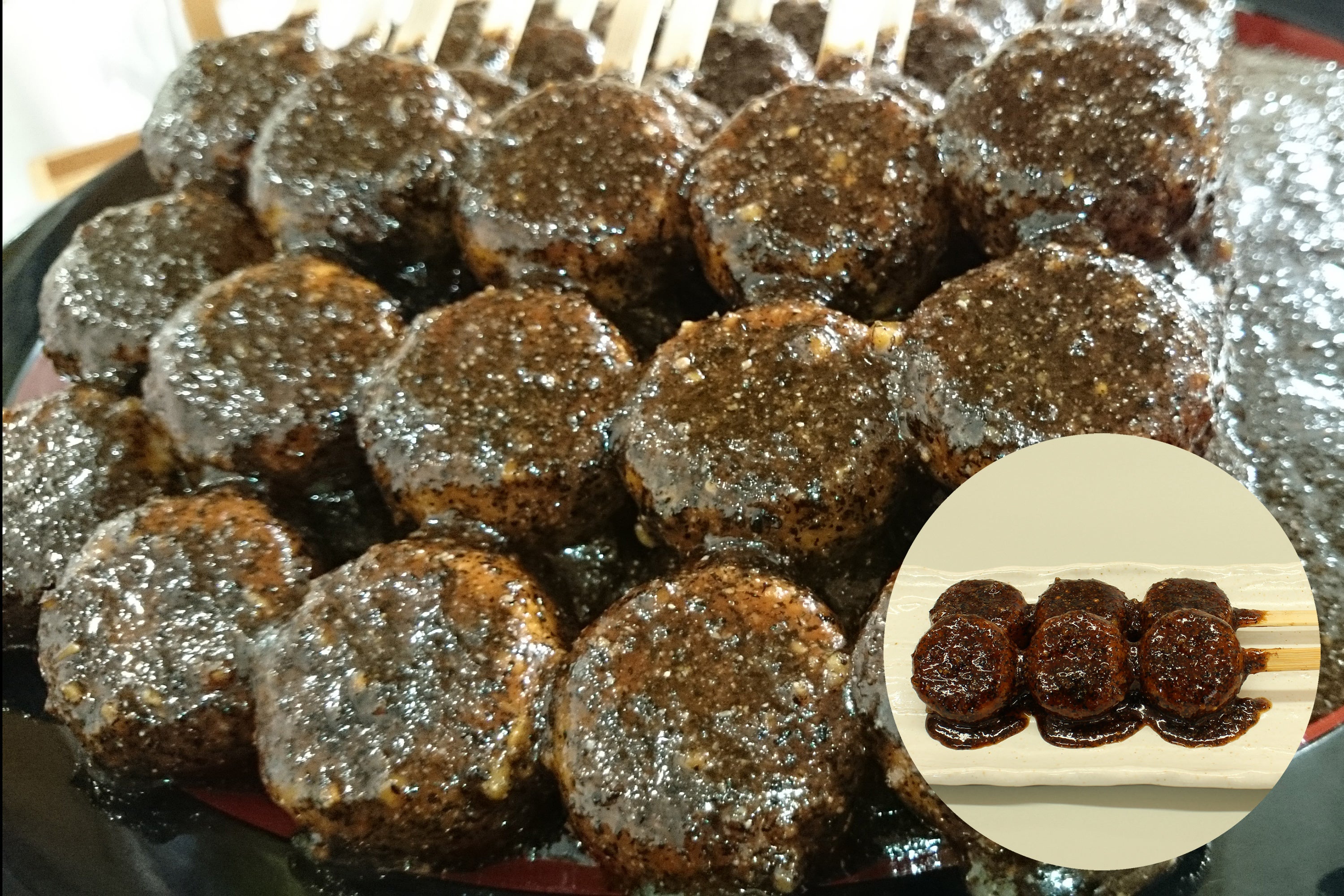 くるみ・えごま・ごまをたっぷり使用した醤油味噌たれの三ツ玉五平餅。