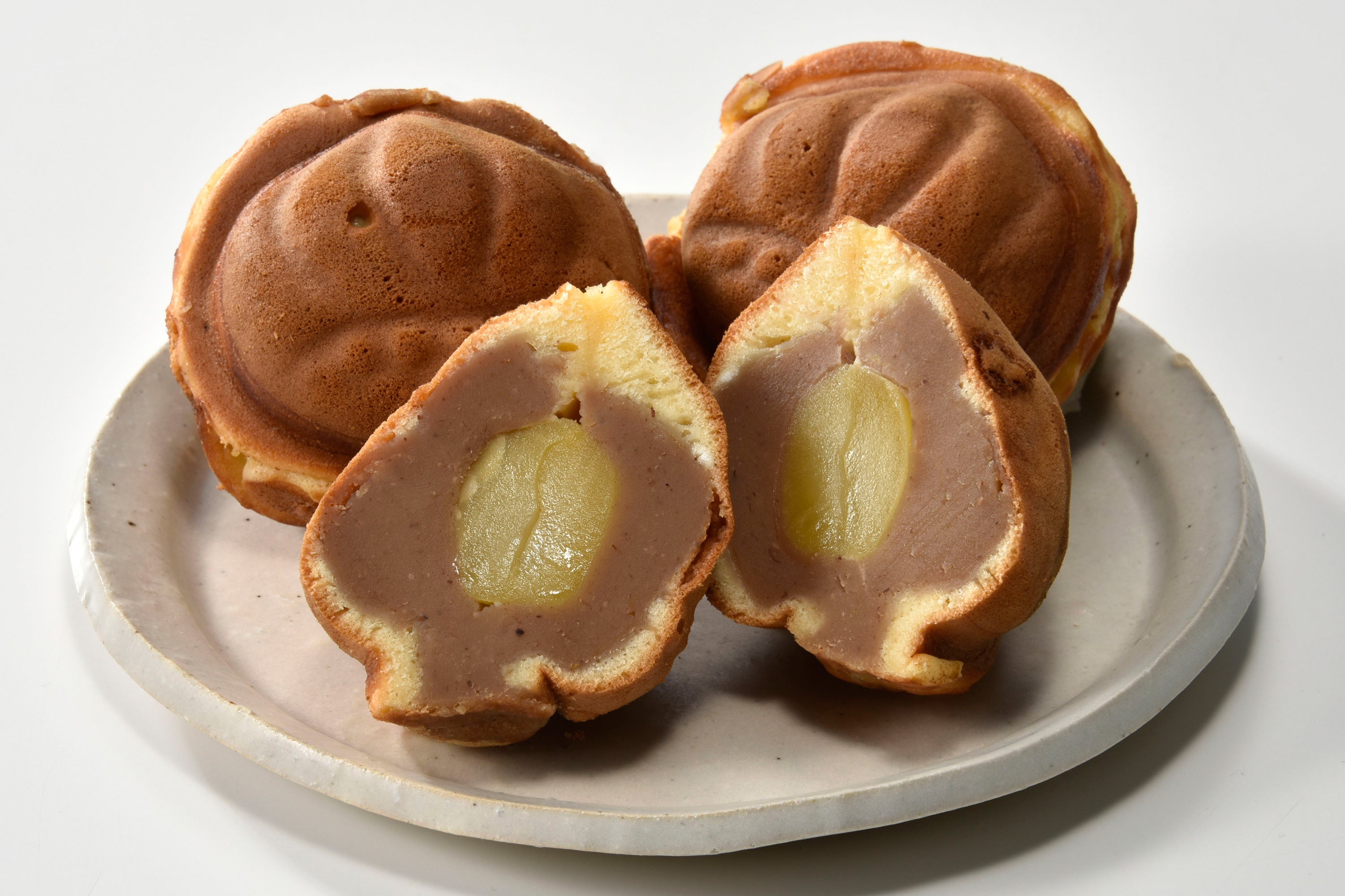 カステラ生地に特製の渋皮煮と栗庵を入れて焼き上げた幻の栗饅頭。