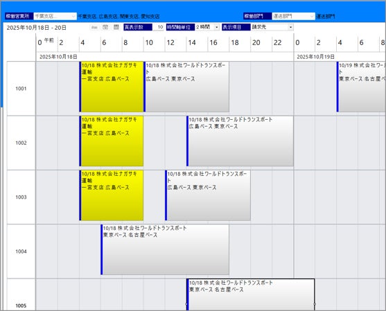 ・時間軸配車(ガントチャート):時間帯別の稼働状況を可視化し、労働時間規制に準拠した配車計画を支援。