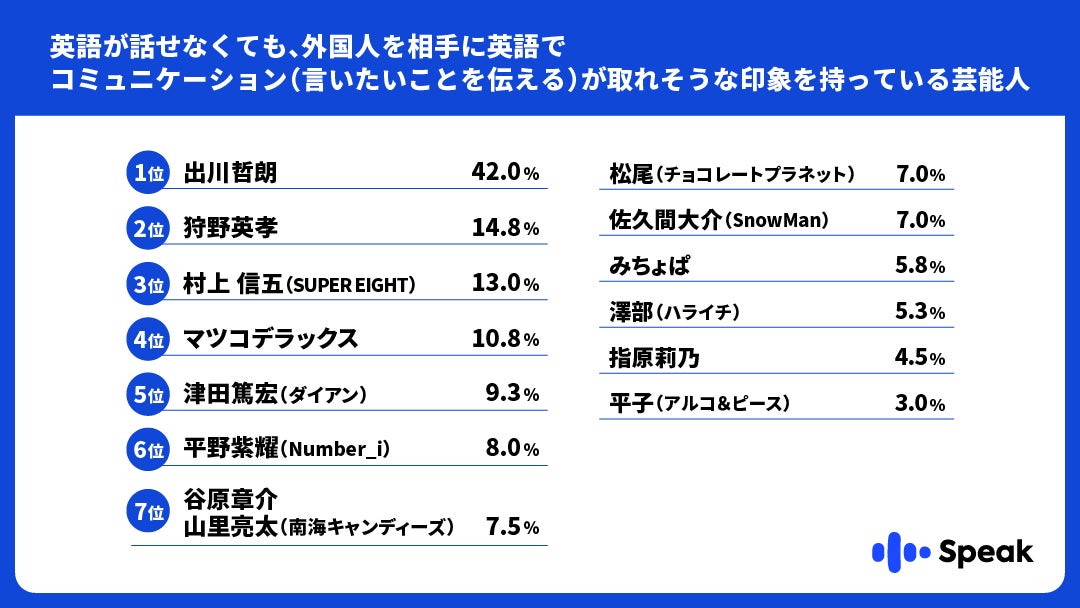 英語が話せなくても、外国人を相手に英語でコミュニケーション(言いたいことを伝える)が取れそうな印象を持っている芸能人を聞いたところ、バラエティ番組や海外ロケで身振り手振りを使いながら英語を使う印象が高い出川哲朗さんが選ばれた