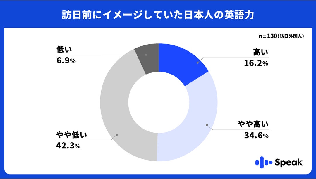 ・およそ半数の外国人が訪日前は、「日本人の英語力は低い(49.2%)」と考えていた(低い6.9%、やや低い42.3%)