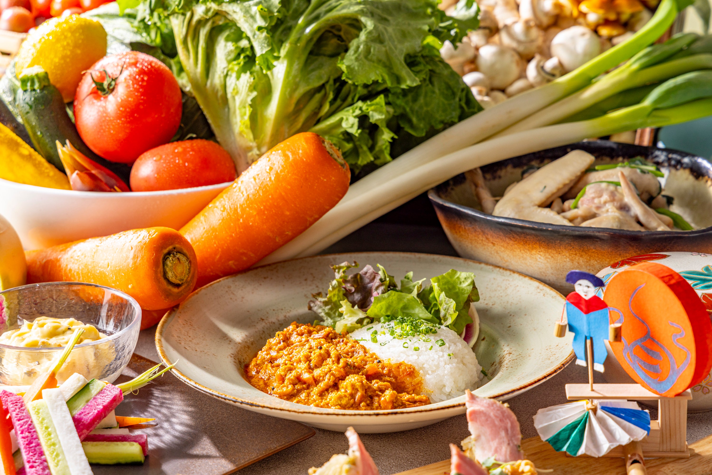 犬山市栗栖地区の農家の方々から直接仕入れた新鮮な野菜を使用したサラダやオリジナルディップソースのサラダコーナーに、城下町にある小松屋商店の生芋100%手練り玉こんにゃくと和牛の筋肉を煮込んだ味噌煮込み、体にやさしい食品を手作りし続け、無添加でお届けする「サイトウハム」のハムをサンドウィッチやカナッペなどにアレンジしたメニューをはじめ犬山ならではの食材を中心にビュッフェスタイルで提供します。ホテルインディゴ犬山有楽苑らしく素材をクリエイティブにアレンジしたメニューのラインナップをお楽しみください。