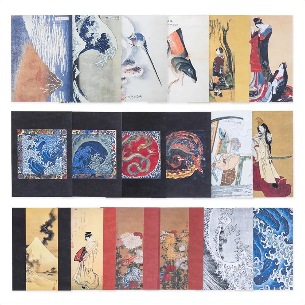 赤富士(凱風快晴)/神奈川沖浪裏/雪中せきれい/塩鮭と白鼠/柳下傘持美人/二美人/怒涛図 男浪(全体)/怒涛図 女浪/龍図/鳳凰図/夢見る娘/白拍子/富士越龍/八朔太夫図/菊図 左/菊図 右/海上の不二/「怒涛図 男浪(クローズアップ)