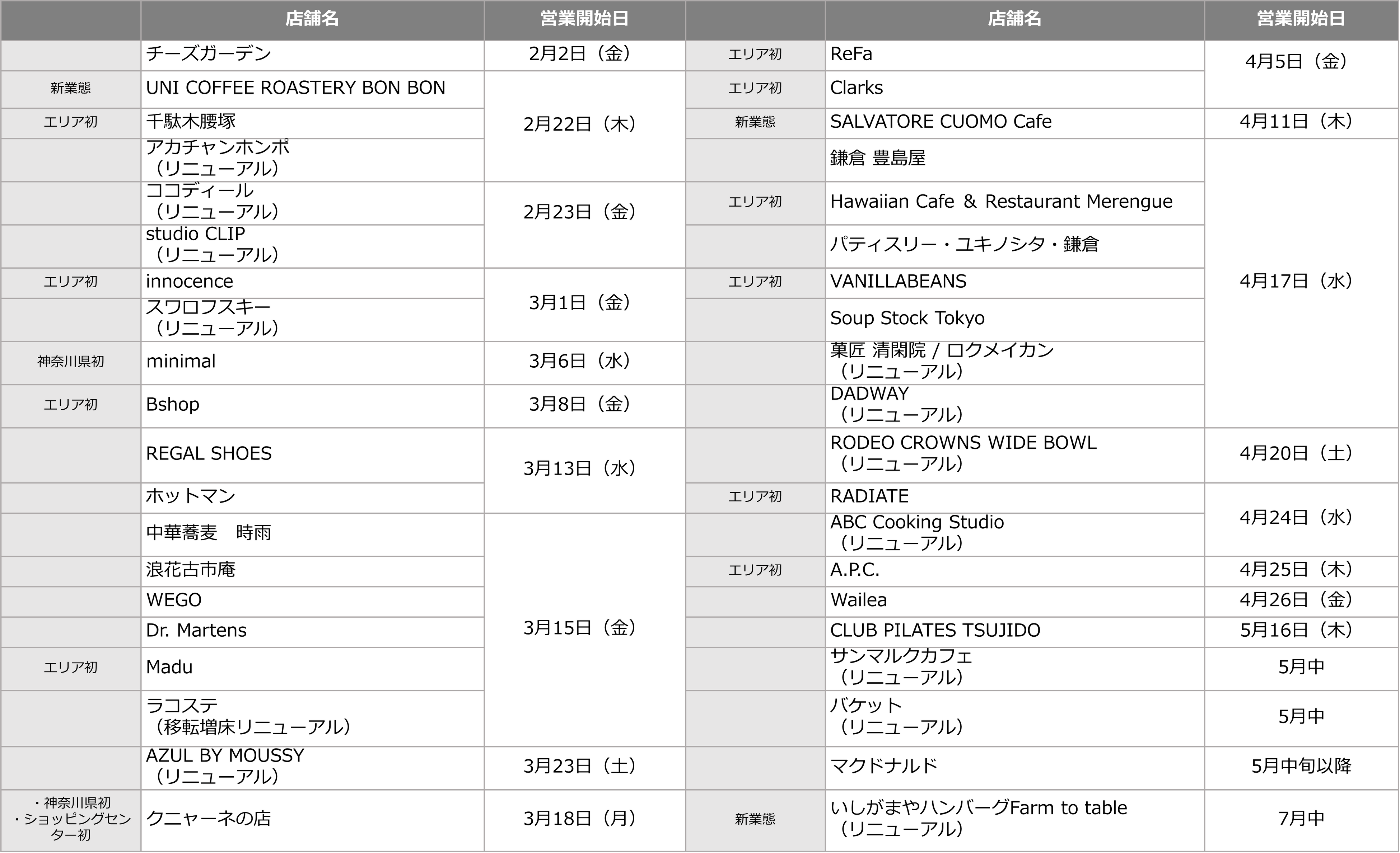 これまでに「UNI COFFEE ROASTERY」初の食物販店舗「UNI COFFEE ROASTERY BON BON」や「千駄木腰塚」、エリア初出店の「Bshop」や、ショッピングセンター初出店の「クニャーネの店」が登場。また「ラコステ」が店舗面積を拡大して移転オープンしました。引き続き7月末までに、新店舗・改装店舗が20店舗オープン予定です。