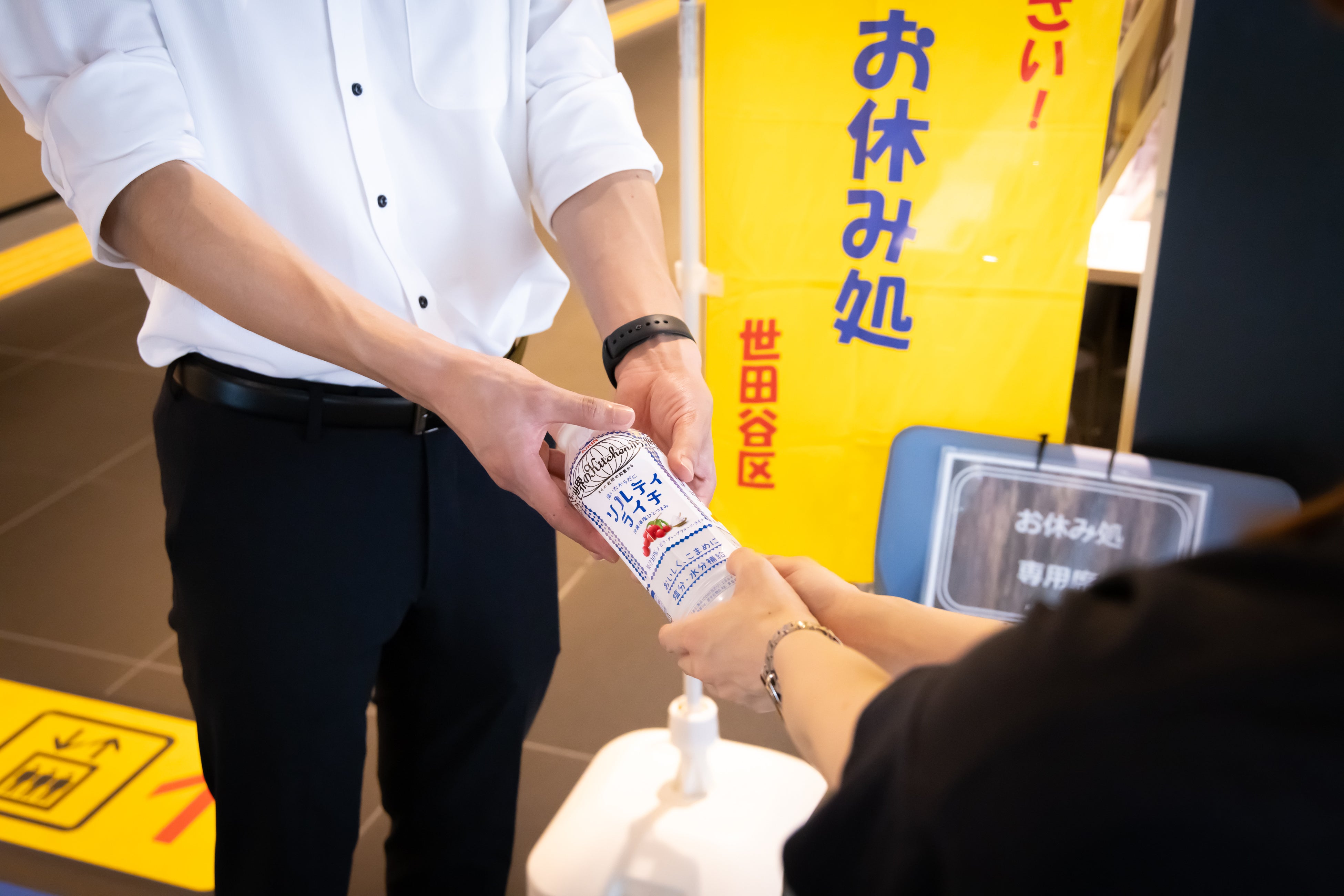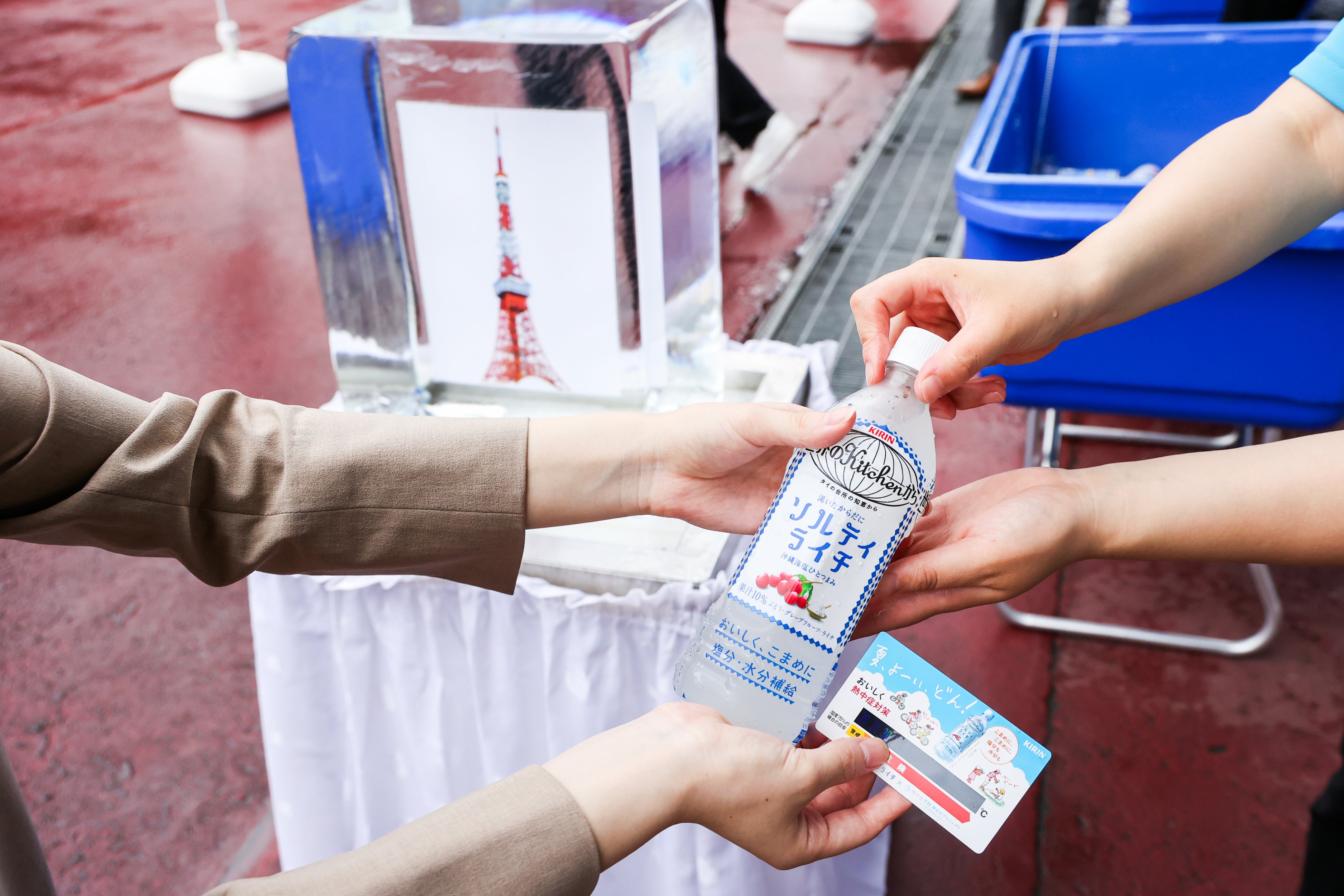 会場内の『ひと涼みスポット』で「キリン 世界のKitchenから ソルティライチ500mlPET」を配布し、地域の方々や、インバウンドを含む観光客の方へも熱中症予防の声かけを行いました。