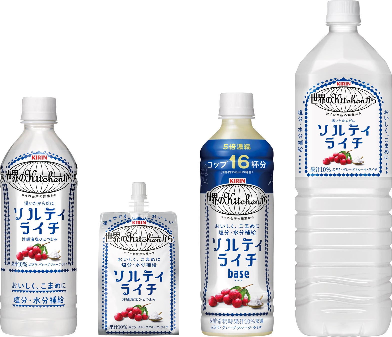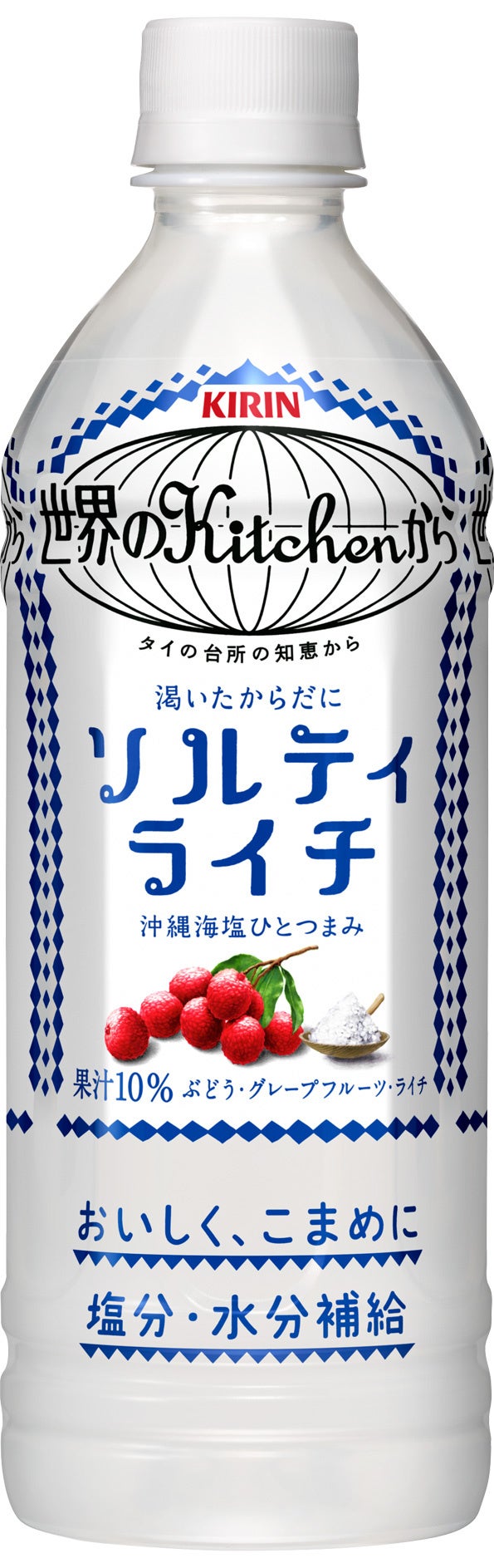 「キリン 世界のKitchenから ソルティライチ」シリーズは、タイ・チェンマイで暑さをおいしく乗りきるために、塩とフルーツと氷を組み合わせて作るタイ伝統の冷たいデザート「ローイゲーオ」からヒントを得て開発しました。旬のライチ※4にひとつまみの沖縄海塩を加えたやさしい甘みのすがすがしい味わいで、おいしく塩分・水分補給ができる飲料です。