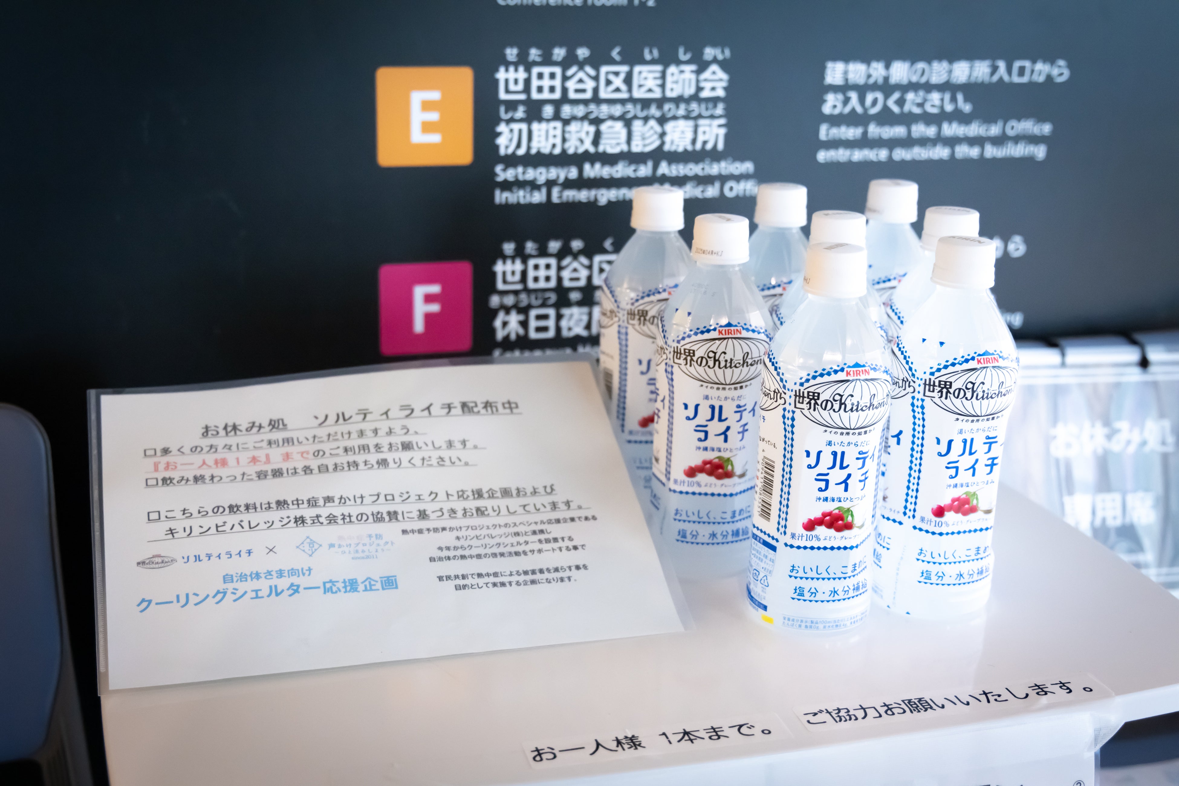 左:提供する「キリン 世界のKitchen から ソルティライチ 500mlPET」/中央・右:配布予定施設の世田谷区立保健医療福祉総合センター「熱中症予防 お休み処」での配布の様子