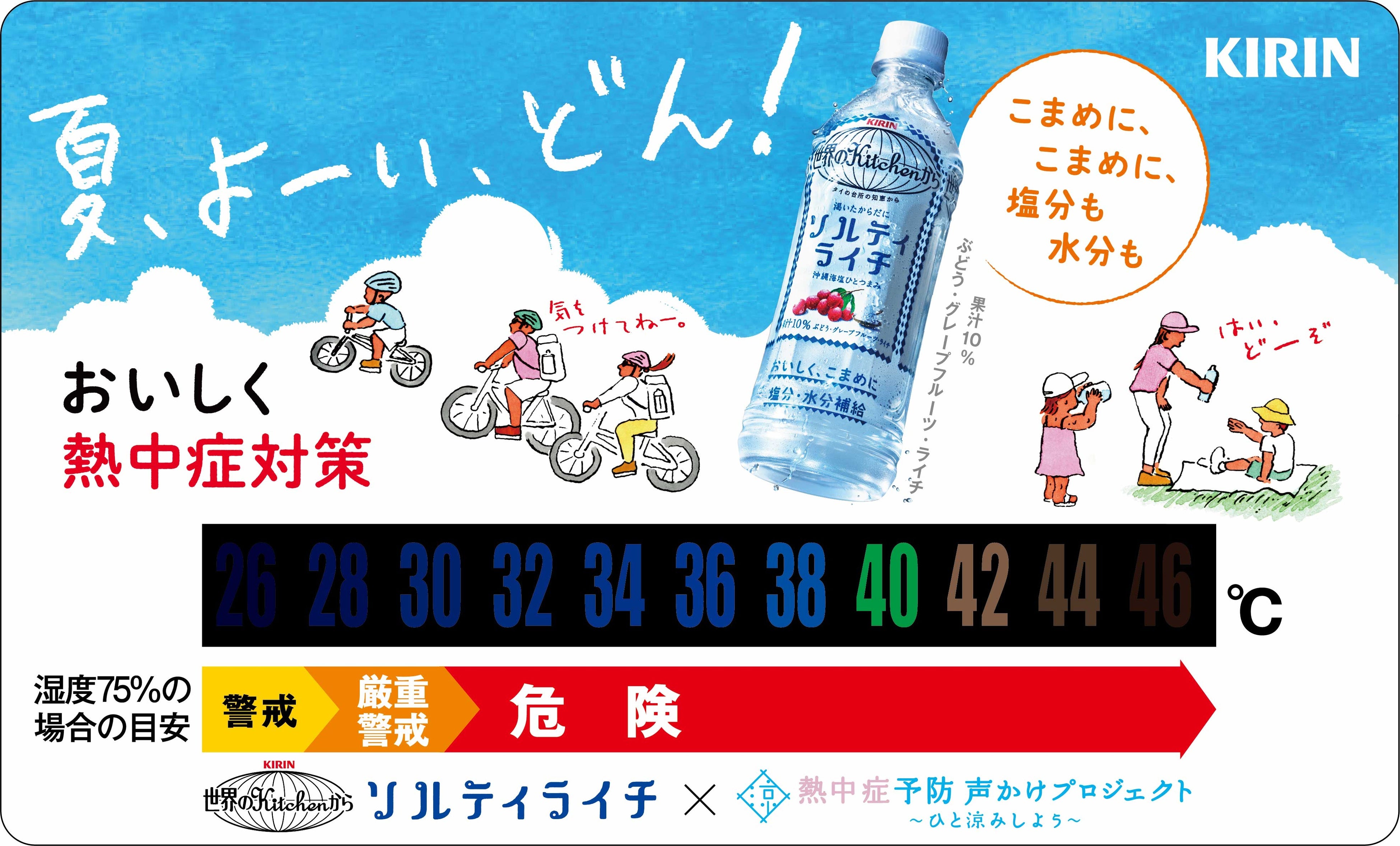 当社は、『熱中症予防声かけプロジェクト』への参画とともに、今後も「キリン 世界のKitchenから ソルティライチ」シリーズを通して熱中症対策の啓発をより強化し、最前線で熱中症対策の声かけを進めていきます。