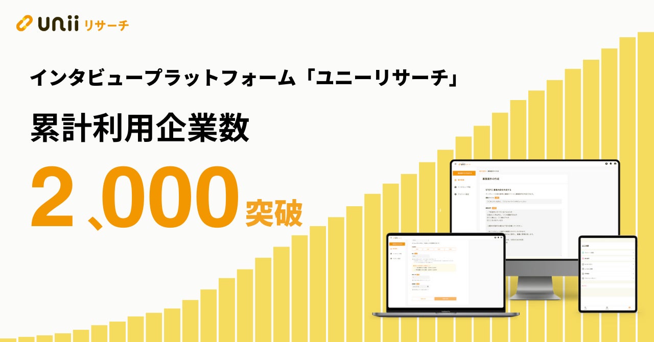 株式会社プロダクトフォース(所在地:東京都渋谷区、代表取締役CEO:浜岡 宏樹 以下 プロダクトフォース)が運営するユーザーインタビュープラットフォーム「ユニーリサーチ(uniiリサーチ)」の累計利用企業数が、2024年6月25日(火)に2,000社を突破いたしました。