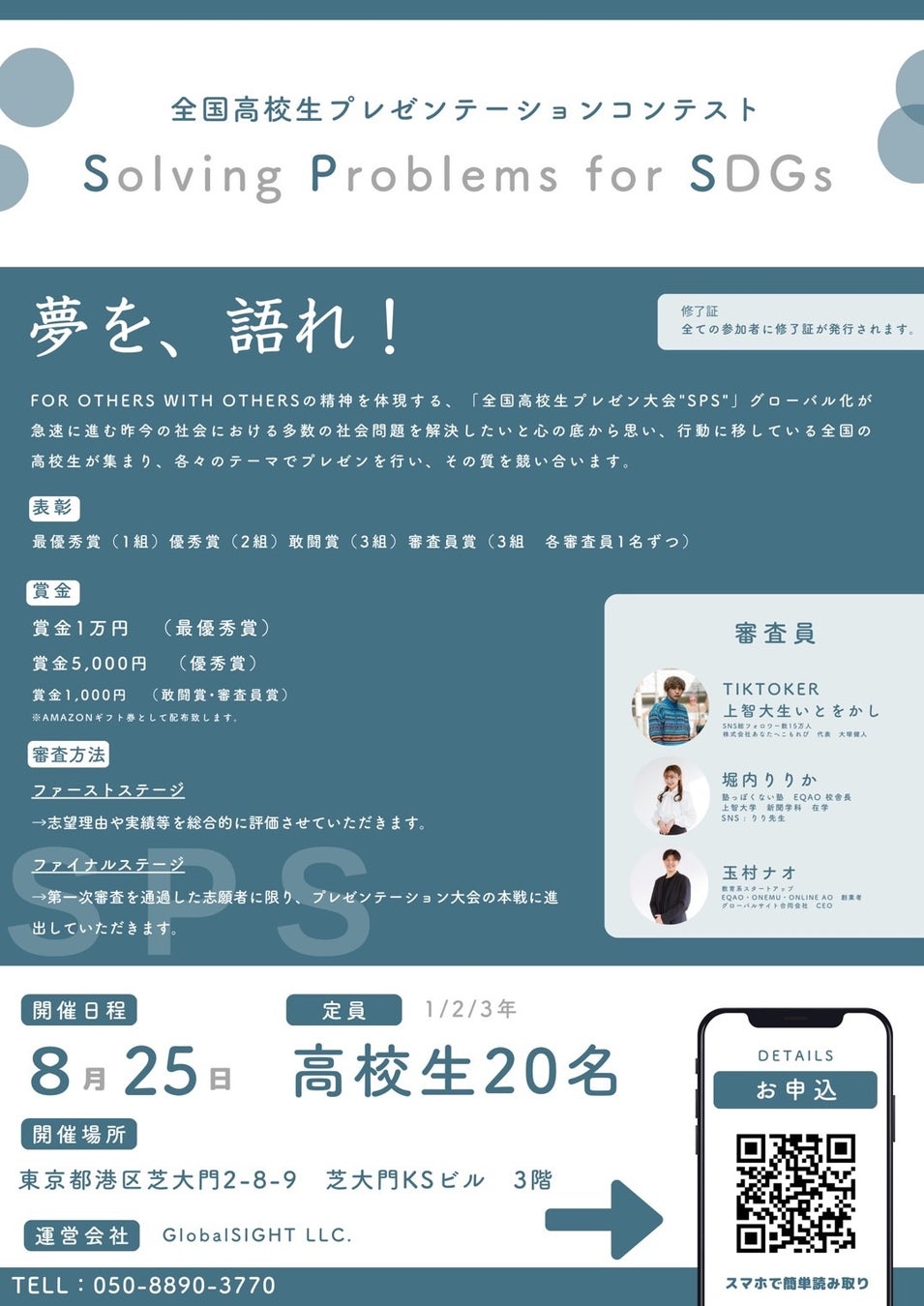 【公募開始】全国高校生プレゼンテーションコンテストSPS(Solving Problems for SDGs)参加者には修了証も発行!入賞者には賞金も!