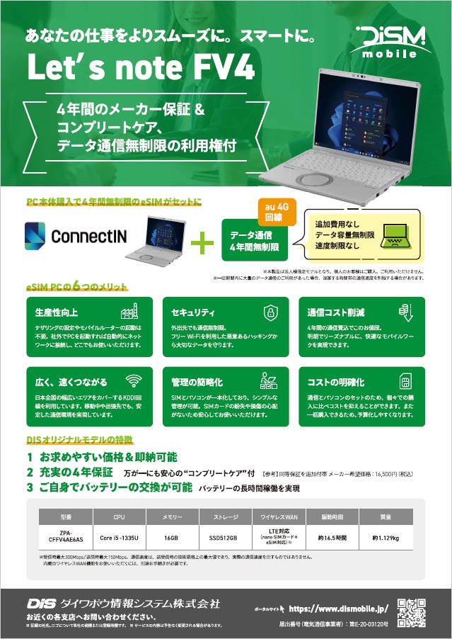 今回、パナソニック コネクト株式会社(本社:東京都中央区、代表取締役 プレジデント:樋口 泰行)との協業にて、「軽量」「長時間」「頑丈」「高性能」のLet’s noteに4年間データ通信無制限を付けたDISオリジナルモデルを展開致します。