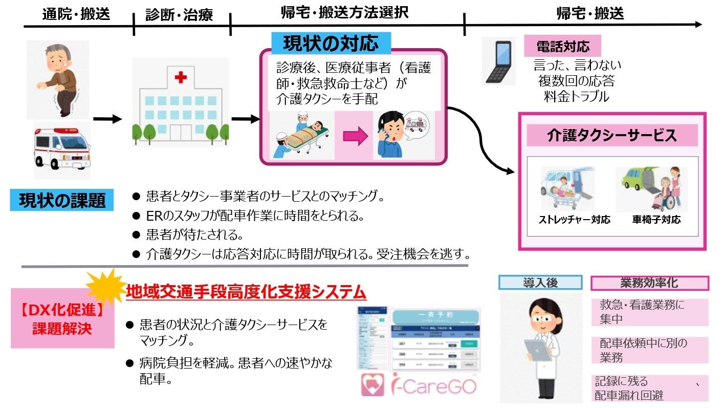 このような背景から、介護タクシー配車アプリを使ってニーズにあった送迎のマッチングを行い、医療スタッフの業務軽減、介護タクシー事業者の受注機会の創出、介護タクシーを利用する方もその家族も安心して利用いただける「効率的かつ自由な外出を支援する”四方よし”の介護タクシーデジタル化」を目指す実証事業を実施いたしました。