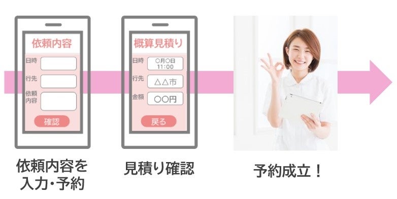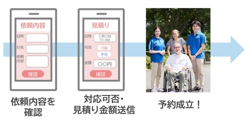 利用者の情報を入力し、配車依頼をすると複数の介護タクシー事業者から見積りが届きます。条件に合致したタクシー事業者を選んで予約が成立します。