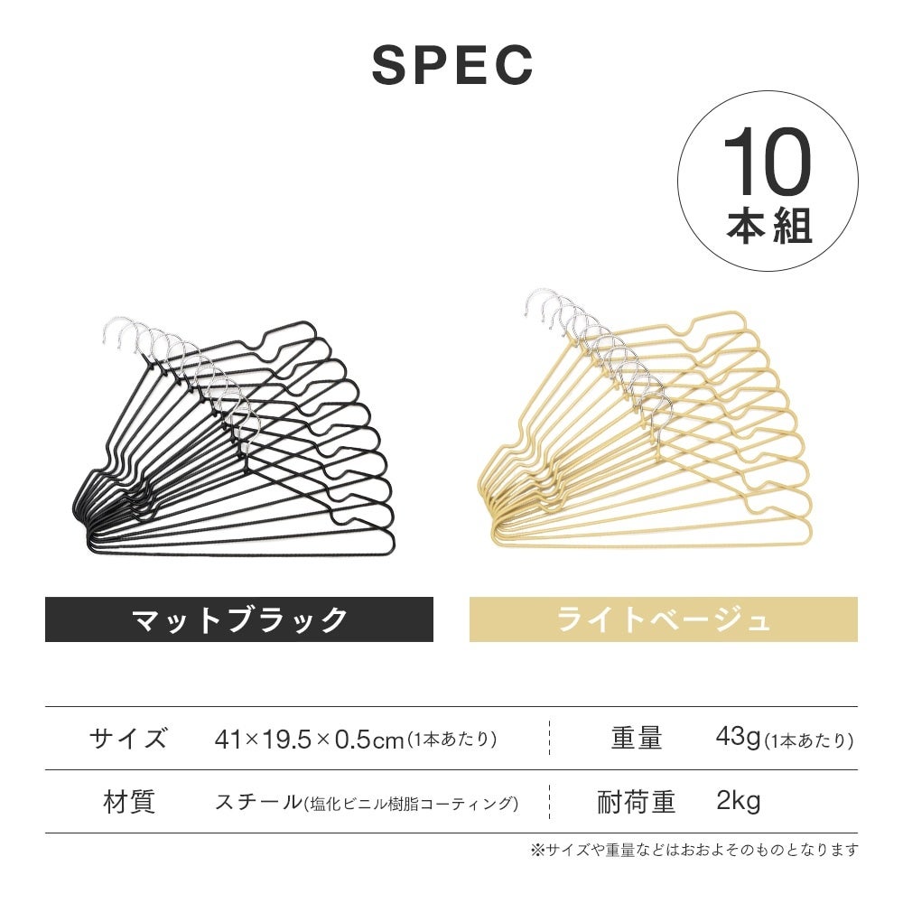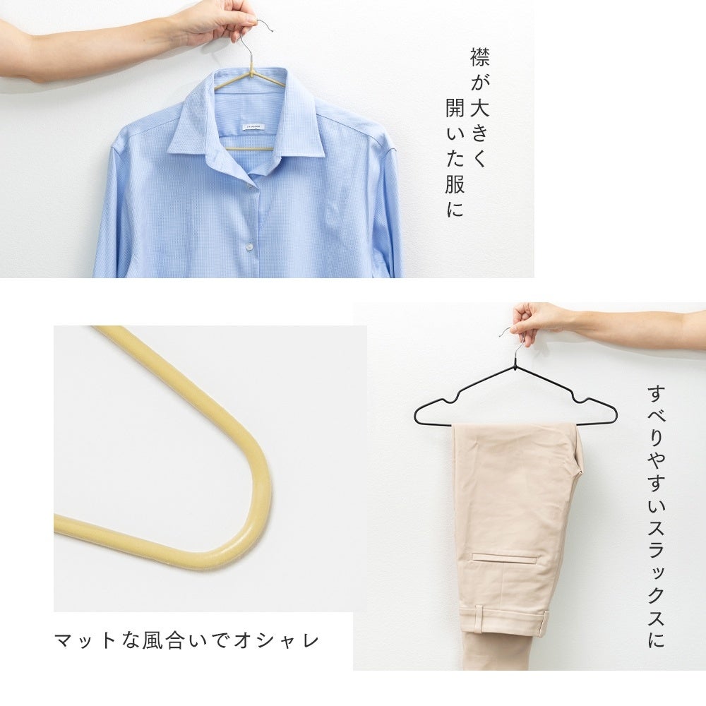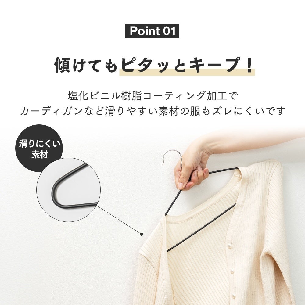 傾けてもピタッとキープ!ノンスリップコーティングですべりにくく、薄型なのでクローゼットもスッキリ!襟が大きく開いた服やスラックスなどのすべりやすい服に。耐荷重2kgなのでコートの収納にも。