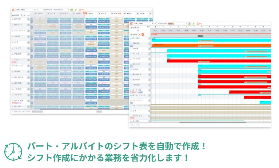 「勤務シフト作成お助けマン」は、シフト表の自動作成・管理ができるクラウドサービスです。最適化AIによりスタッフの希望や勤務条件を反映したシフト表を自動で作成することができ、法令遵守や働きやすさを考慮したシフト表を、誰でも簡単に作成することができます。「早番」「遅番」「夜勤」など「1日1記号を割り当てるシフト表」を自動で作成する「勤務シフト作成お助けマン Day」と、「10:00~16:00」など「日々変動する勤務時間を割り当てるシフト表」を自動で作成する「勤務シフト作成お助けマン Time」のラインナップを用意しています。