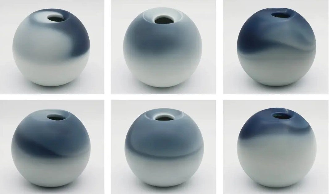 「TIME VASE」が30〜60分ほどかけてゆっくりと元の色に戻るとき、器の模様はまるで美しい景色のように、情緒的に変化します。これは注いだお湯の蒸気による温度変化の細かい「揺らぎ」が生み出したもの。注ぎ入れるお湯の量や、使う環境によっても模様の出方が変わってきます。二度と同じ戻り方をすることはない、繊細な色合いをお楽しみください。