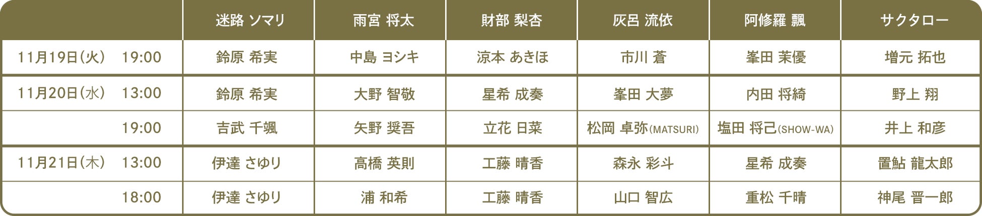 ※役内50音順 ※キャストによっては、回によって配役が異なる場合がございます。詳しくはスケジュールの出演表をご確認ください。