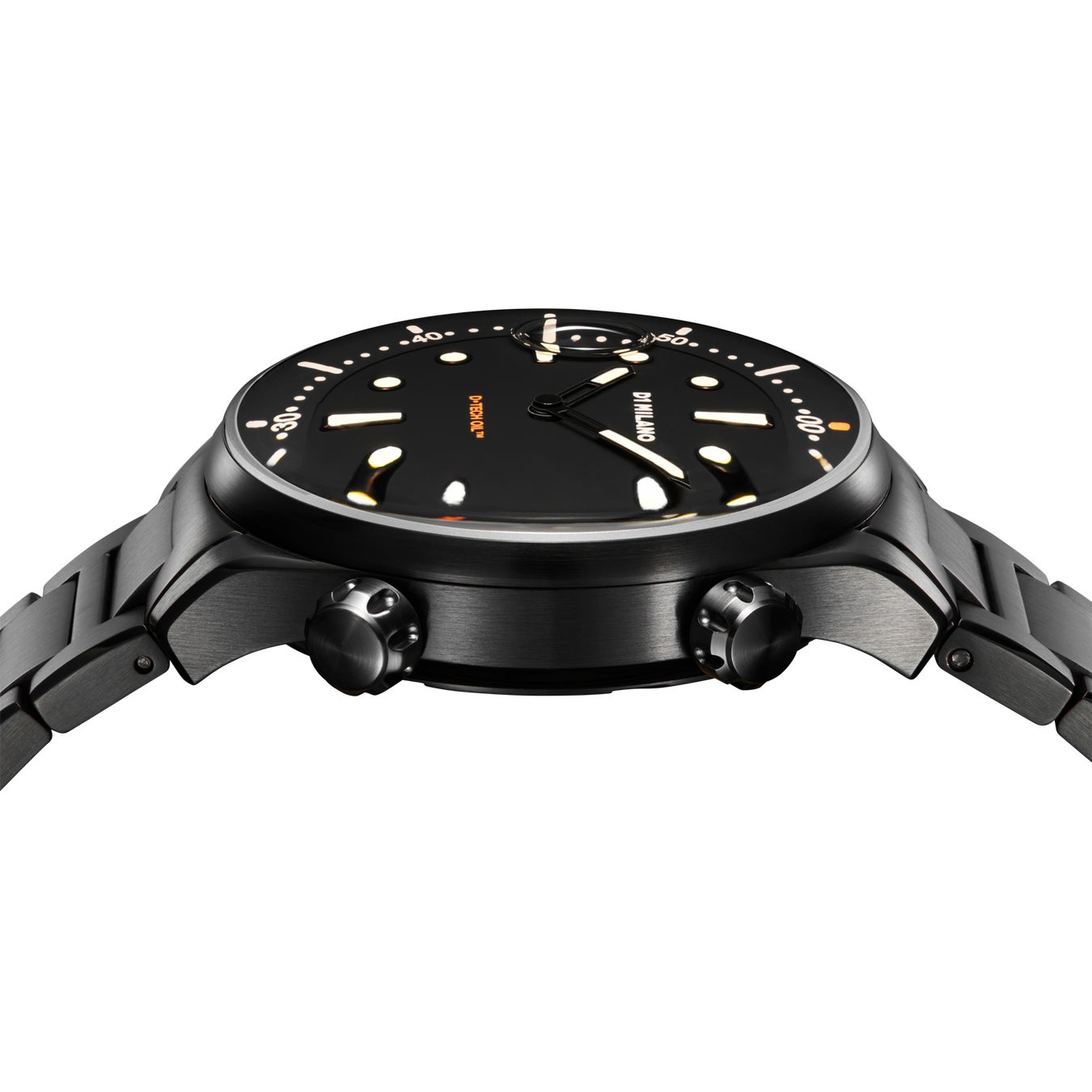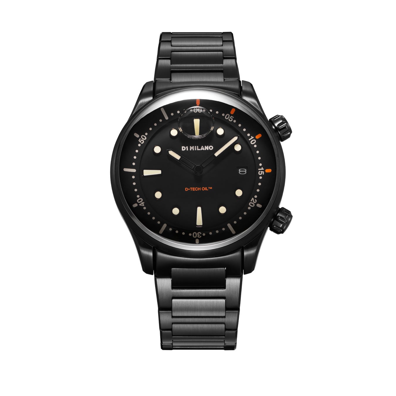 また、この特殊なオイルは、時計部分の潤滑を維持し、正確な時間計測を向上させる役割も担っている。漆黒のダイヤルには、ホワイトとオレンジの鮮やかなコントラストのあるディテールが施され、ケース径39mmのブラックステンレスケースに同色のステンレスバンドを備えている。