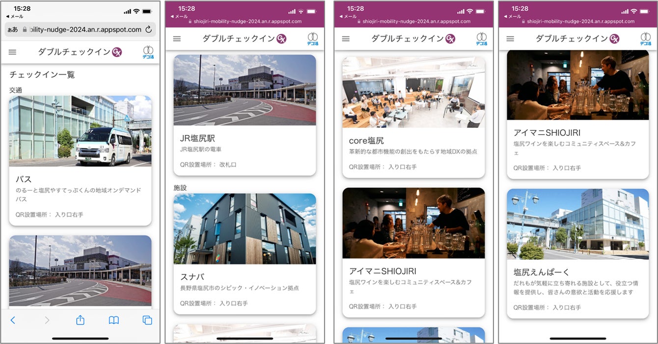 当社では、環境省ナッジ実証事業での社会実験の一つとして、塩尻市の皆さまの協力を得て、「ダブルチェックイン・ゲーム」アプリの開発を進めています。このアプリは、地域に貢献したいという皆さまの気持ちに働きかけて、「みんなで一緒に、楽しく、電車・バスを利用しよう」というコンセプトで、「人流・滞留・交流(街に出て、場所にとどまり、人と人がつながる)」を促して、ハードインフラではなく、需要側からコンパクトシティを実現するという思想で設計しています。