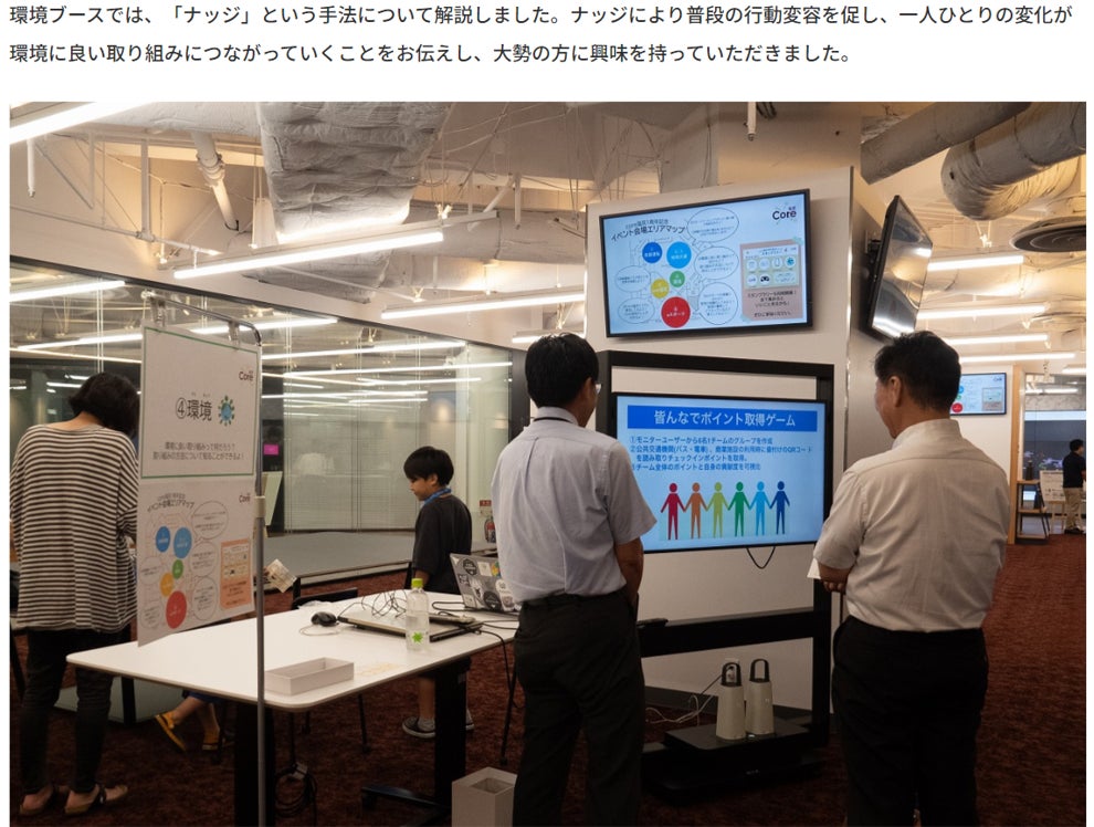 2024年7月6日(土)には、塩尻市振興公社の主催する、core塩尻1周年記念イベントで「環境」ブースを出展し、塩尻市のご協力の下、塩尻市民の皆さまに、移動ナッジ実証やスマフォ・ゲームアプリ「ダブルチェックイン」の開発についてご説明し、その実用性についてのご感想やご意見を伺うとともに、ナッジモデルやスマフォ・アプリの改善策についてフィードバックをいただきました。