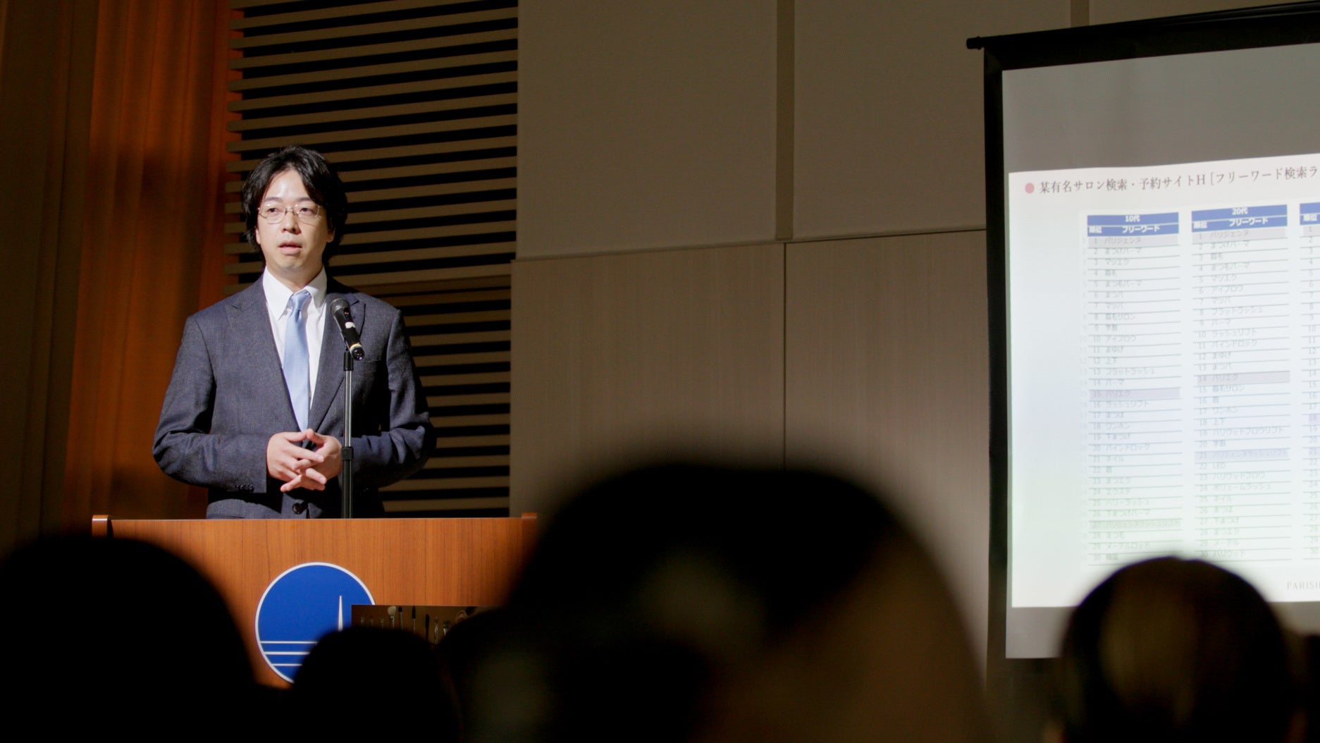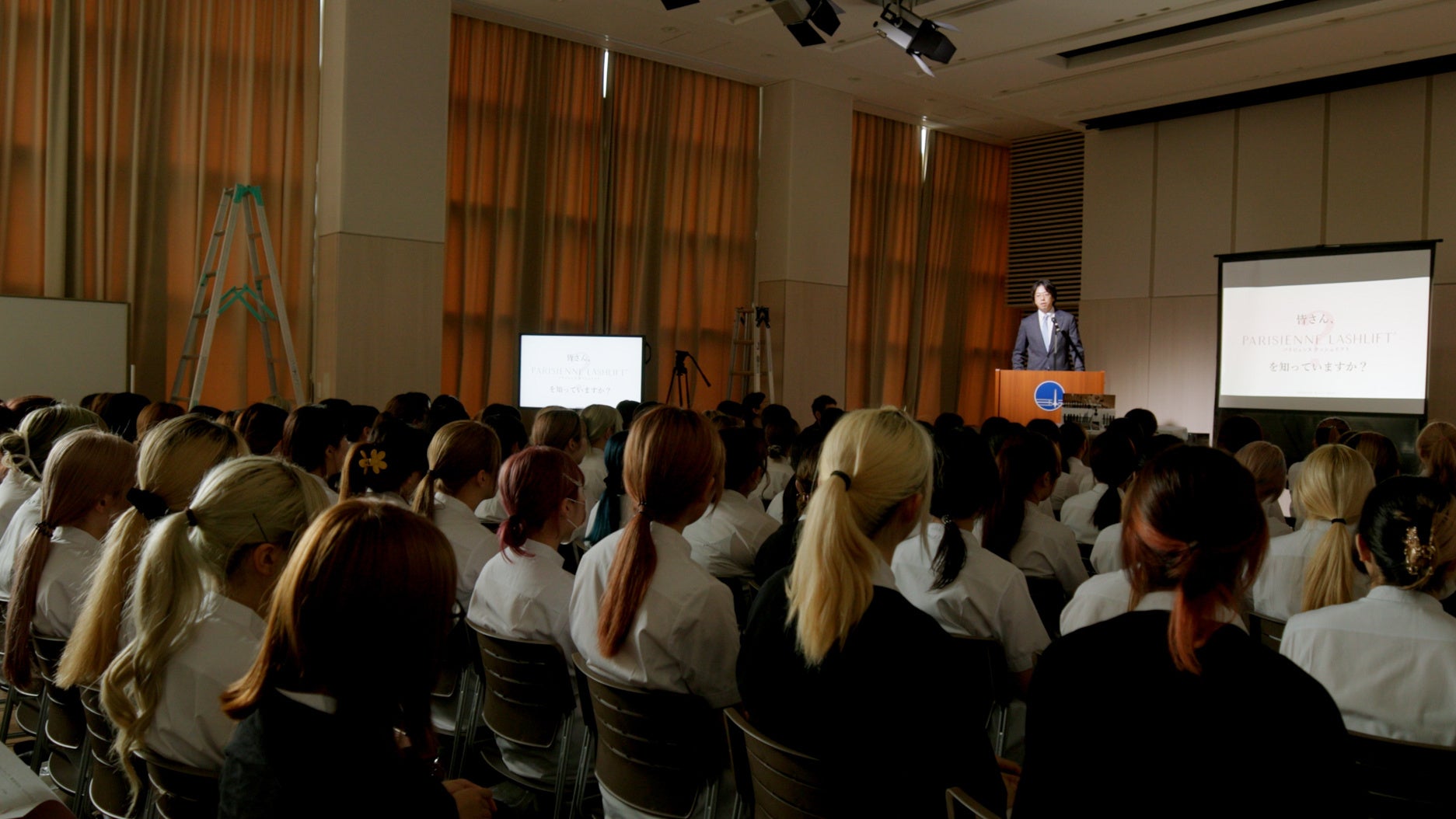 特別授業のスタートは、パリジェンヌビューティーグループ取締役(副社長:伊賀陽史)より会社概要を紹介。続いて、パリジェンヌラッシュリフトの開発秘話や美容の最新トレンド、セルフブランディングについてなど美容業界を志す上で必要になる情報をお伝えし、最後に学生へのメッセージで締めました。