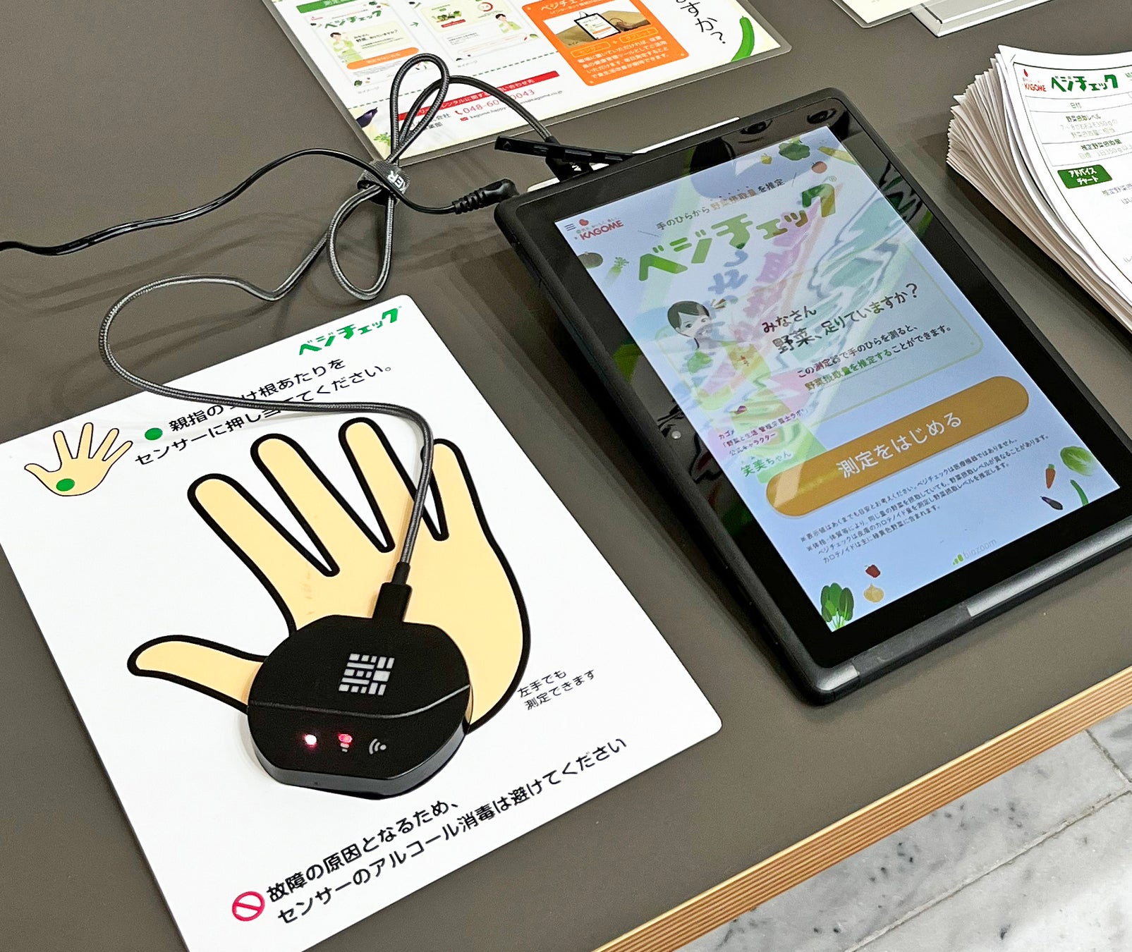 ※「ベジチェック®」はカゴメ株式会社の登録商標です。手のひらをセンサーに約30秒あてるだけで、簡単に推定野菜摂取量を見える化できる機器です。
