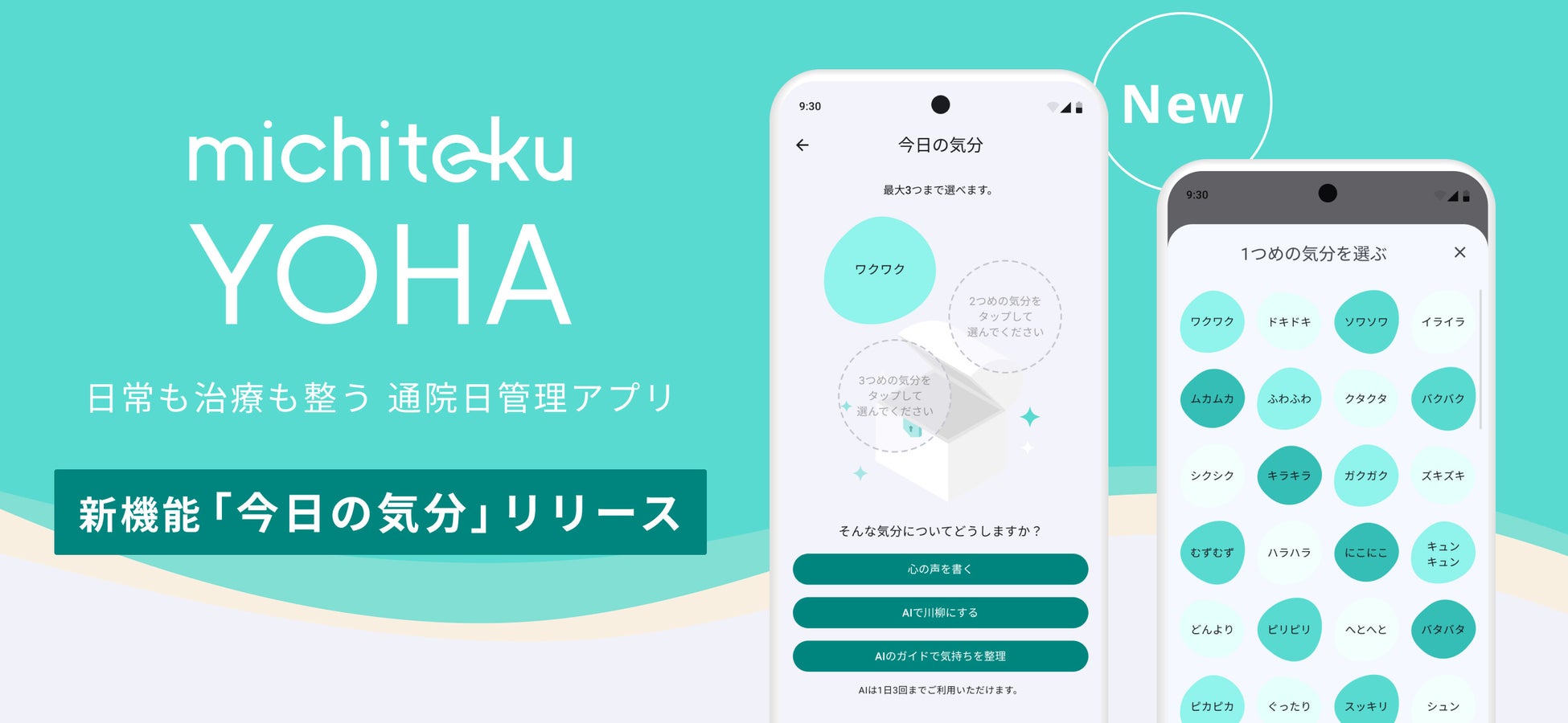 株式会社michiteku(本社:東京都中央区、代表取締役社長:藤山 昌彦、以下「当社」)は、がん患者さんのための通院日管理アプリ「michiteku YOHA(よは)、以下「YOHA」」にAIを活用した感情整理・記録機能「今日の気分」を新たに追加して提供を開始しましたので、お知らせします。