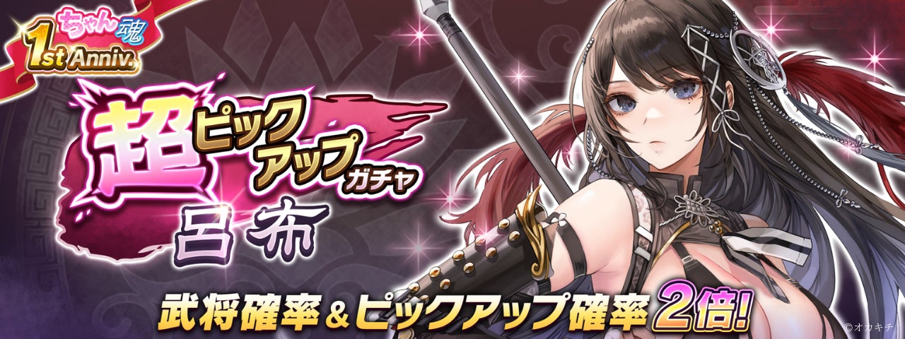最強の武将として名高い呂布がピックアップガチャで再登場します。さらに今回は通常のピックアップガチャと比べて、武将の出現確率とピックアップの出現確率が2倍となっております!