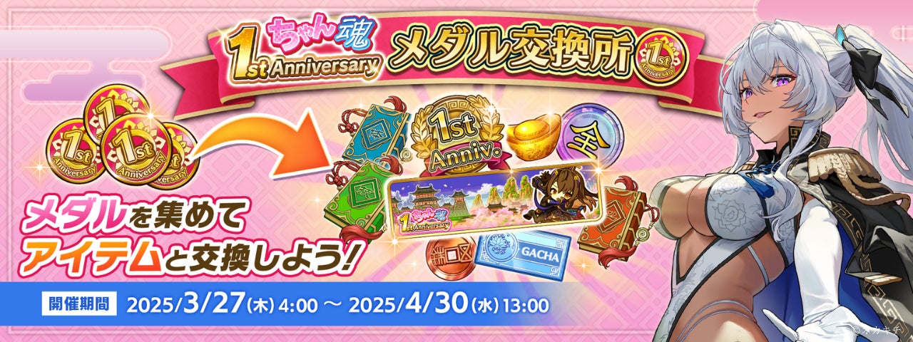 1st Anniversary専用の交換所を開設します。ログインボーナスや特別任務で獲得した記念メダルは、交換所で様々なアイテムと交換することが可能です!