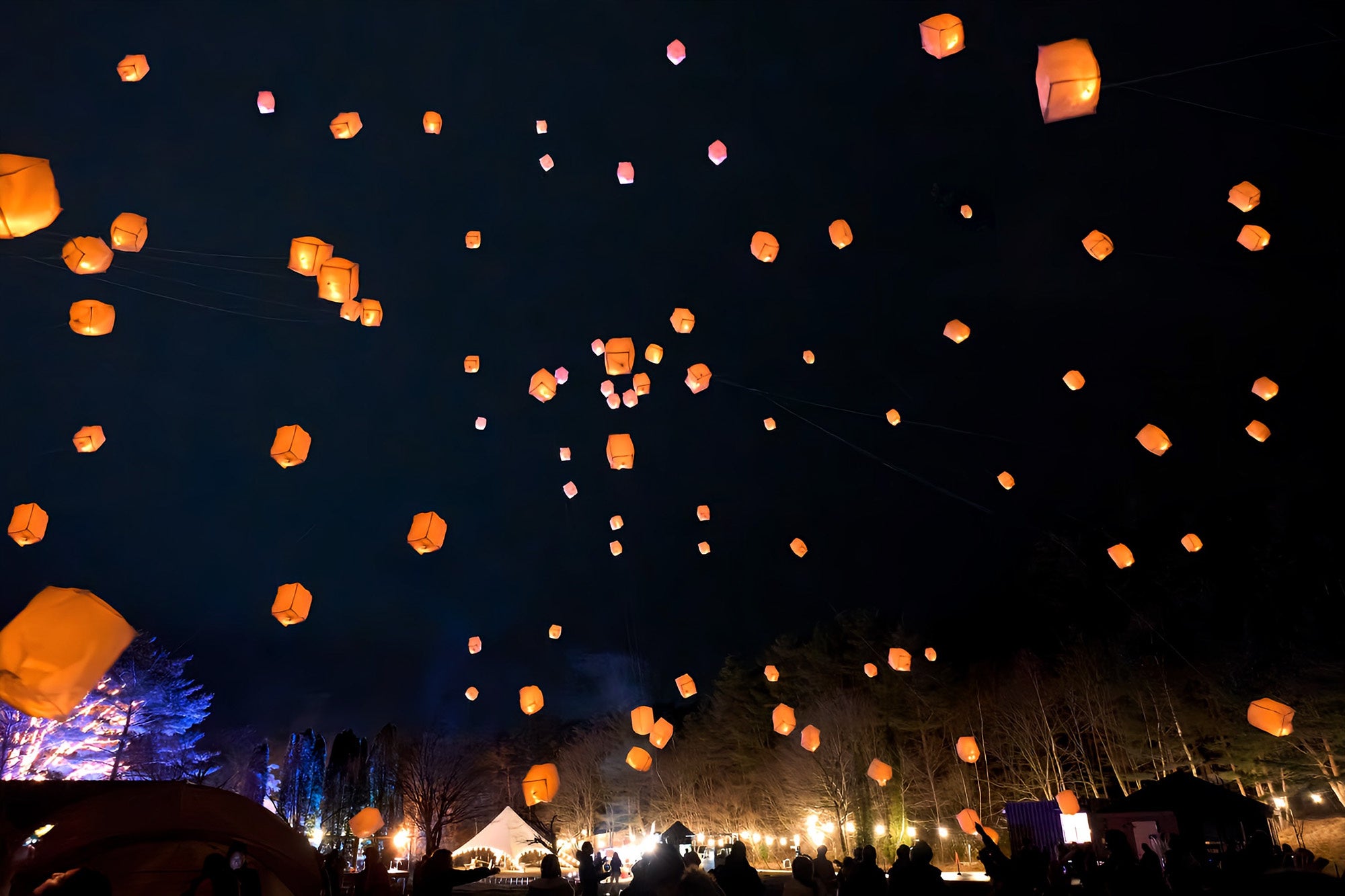 ランタンイベントでは、約400個のLED製のランタンがカウントダウンに合わせて一斉に宙に浮かび、富士山のふもとに幻想的な空間が出現した。