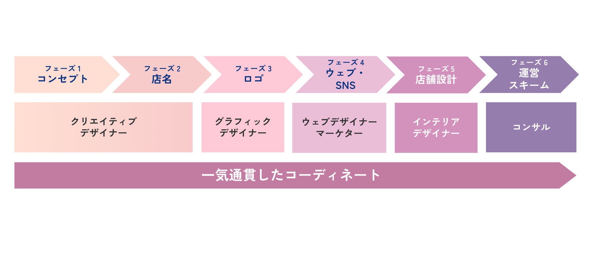 ブランディングにおいては、コンセプトから店名、ロゴ、ウェブ・SNS、空間設計、運営にいたるまで、デザインの統一が欠かせません。これらを別々のプロデザイナーに依頼すると、手間やコストがかかり、横通しも難しく、事業をはじめる際のハードルが高くなりがちです。