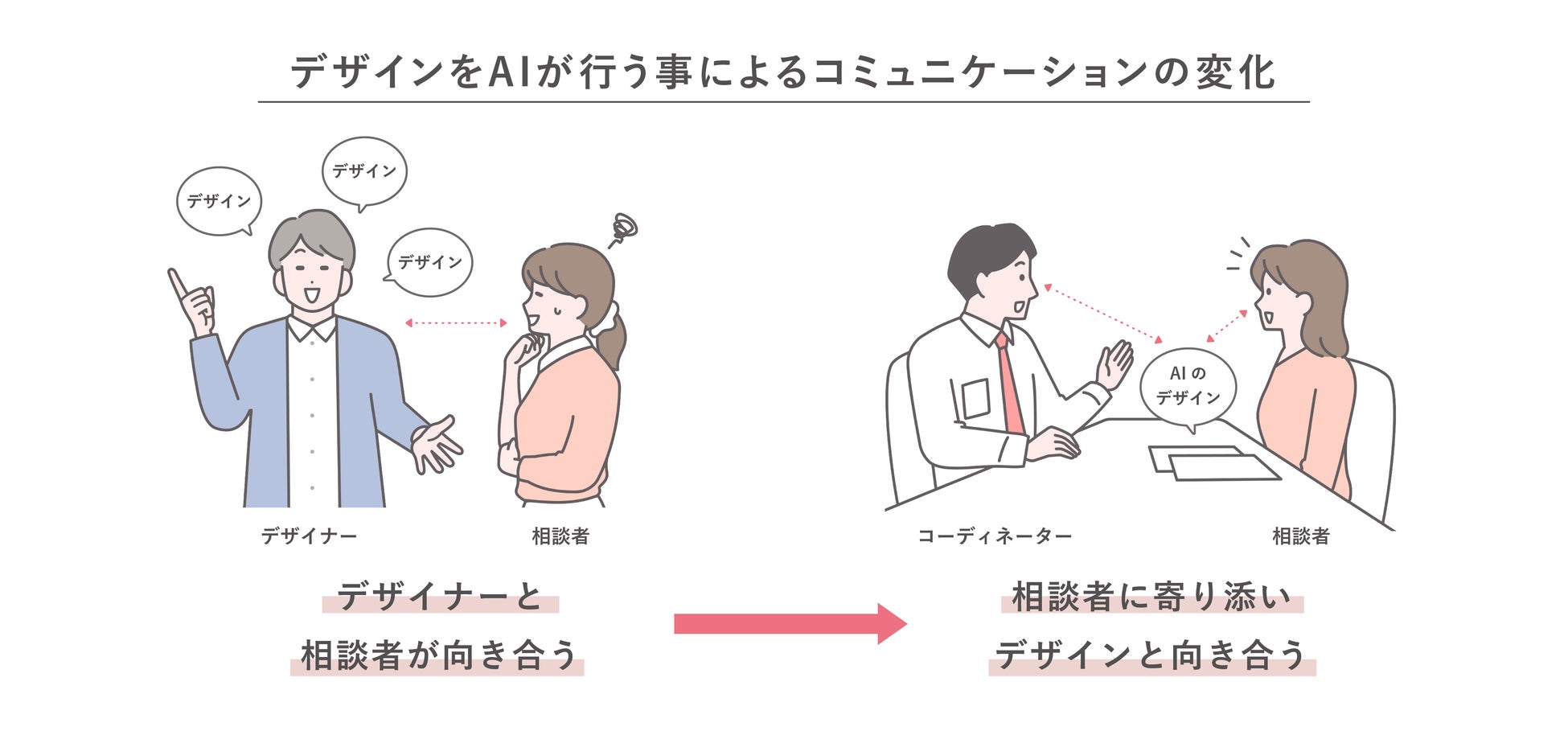 プロのデザイナーとの相談においてはデザイナーに気をつかうことが多い一方、AIに対しては遠慮なく意見を言いやすくなります。そのため、相談者の意向にコーディネーターが寄り添い、率直なコミュニケーションを通して、より良いデザインをつくることが可能です。