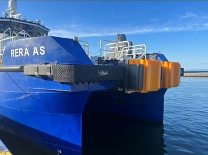 本船にはNOG社が欧州の過酷な海域で運航するCTVで採用しているものと同型のフェンダー(注3)を搭載しています。このフェンダーは本船が風車の支柱に船体を押し付ける際に摩擦力を増加させ、船体を安定させる効果があります。作業員の移乗時の安定性を高め、安全な作業員輸送に直結します。