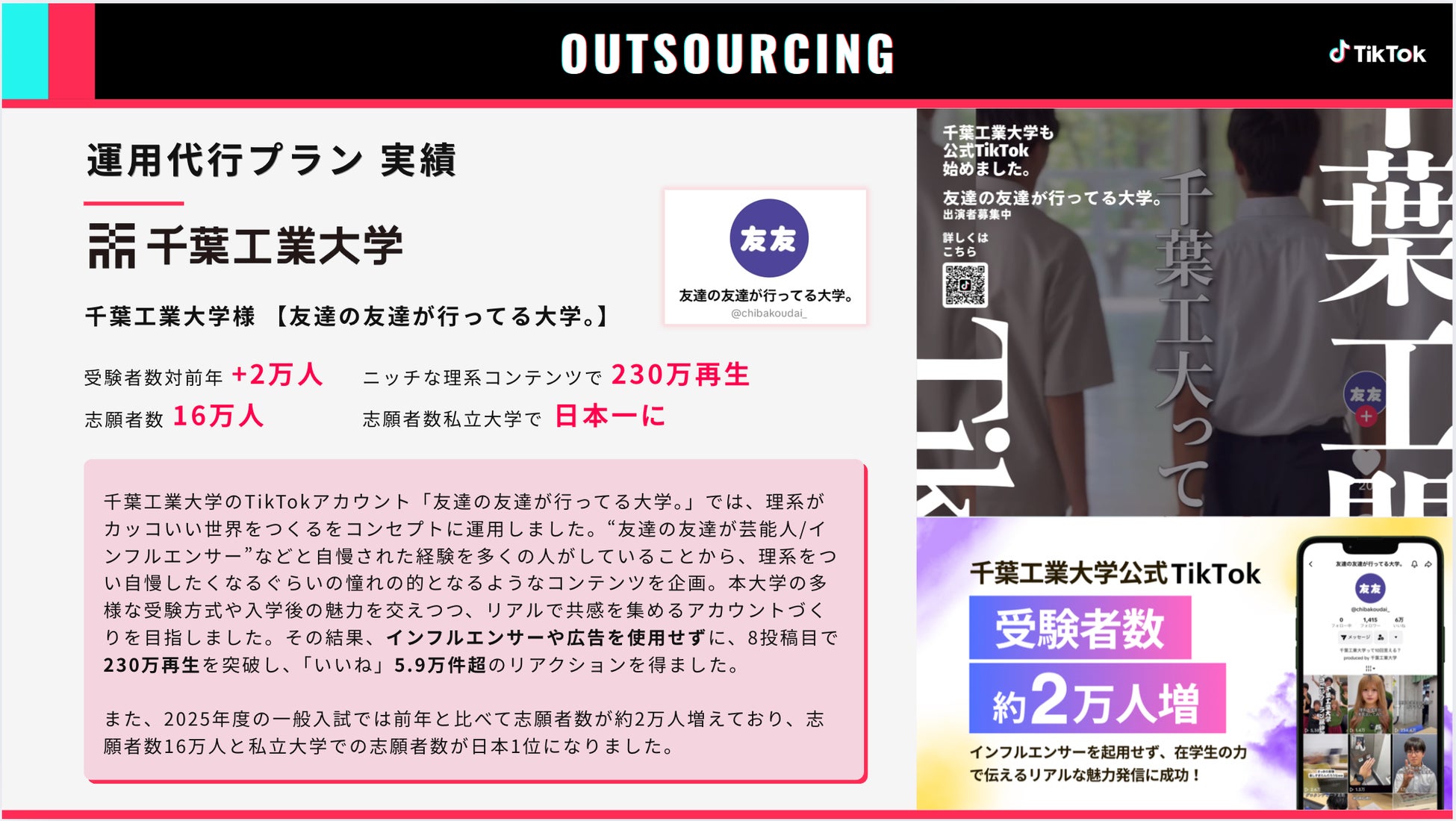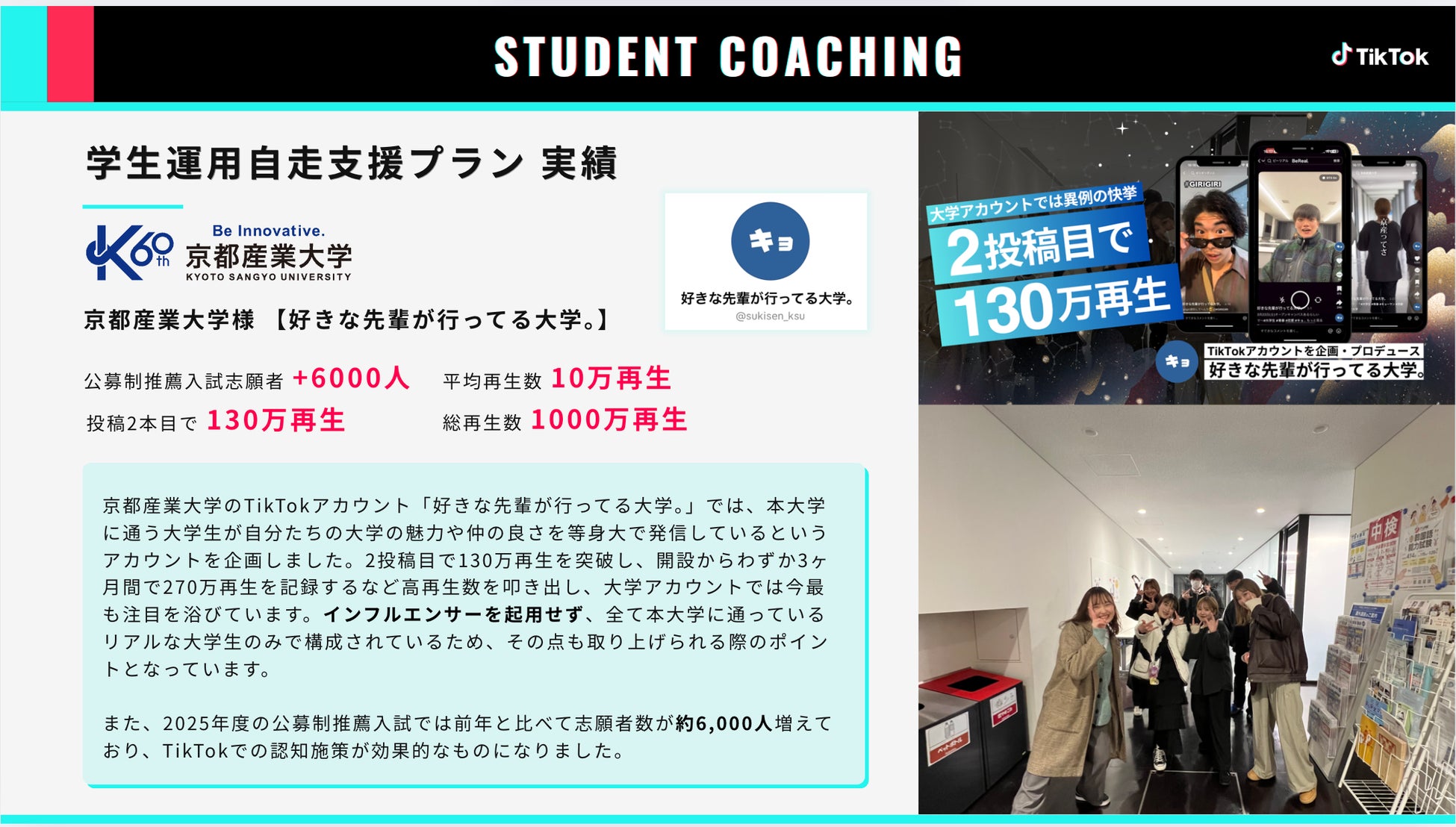京都産業大学では、2025年度の公募制推薦入試では前年と比べて志願者数が約6,000人増加。インフルエンサーや広告は使用せず、全てオーガニック投稿で総再生回数1,000万回超えを記録しています。