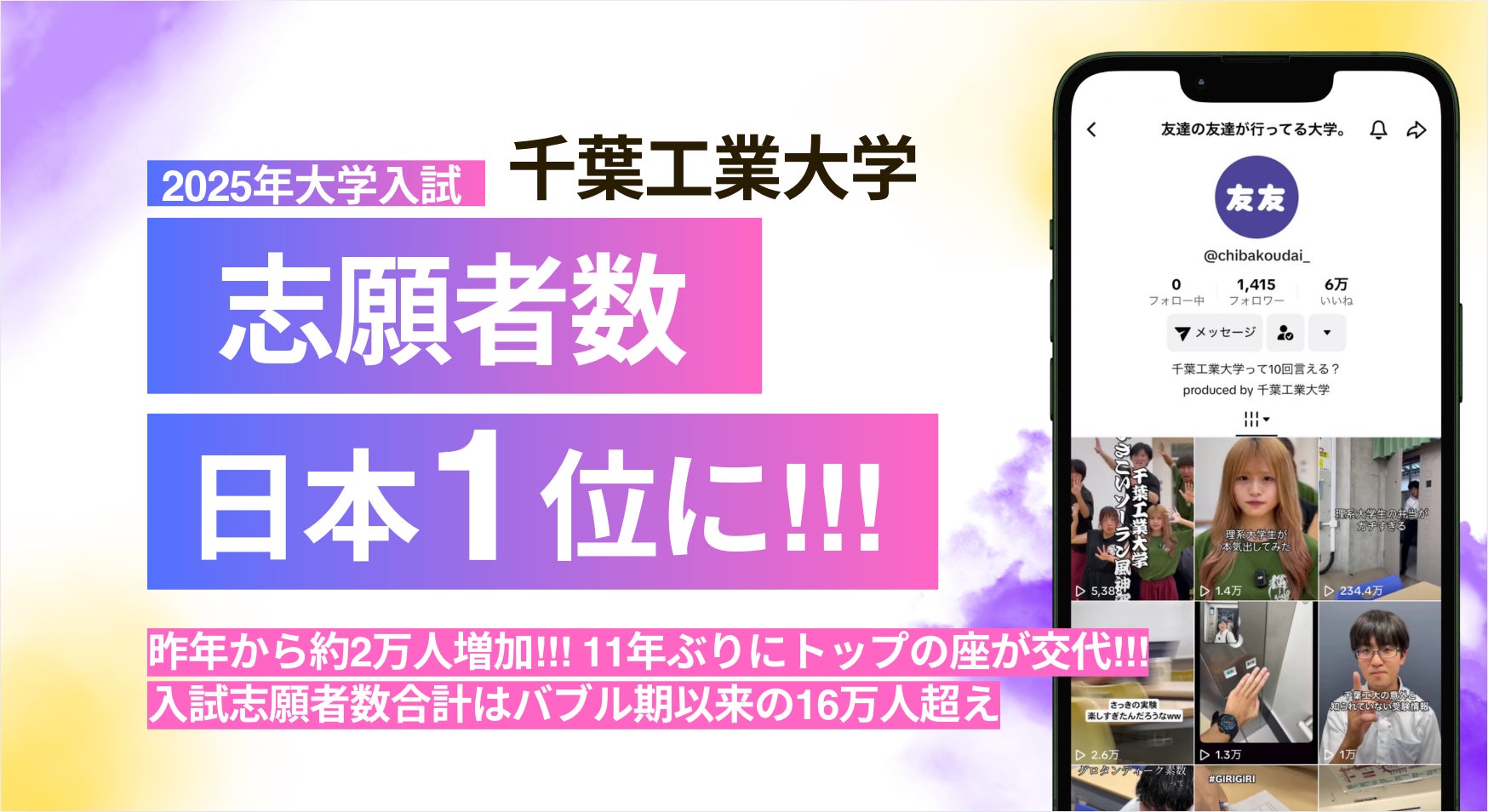 千葉工業大学での実績は2025年度の一般入試では前年と比べて志願者数が約2万人増加し、志願者数16万人と私立大学での志願者数が日本1位になりました。