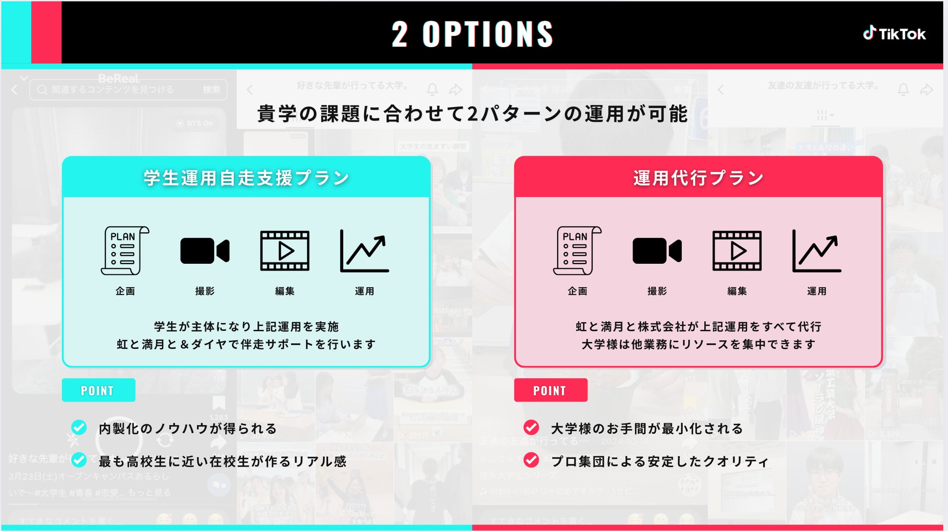 「①学生運用自走支援プラン」「②運用代行プラン」の2パターンのプランをご用意しました。