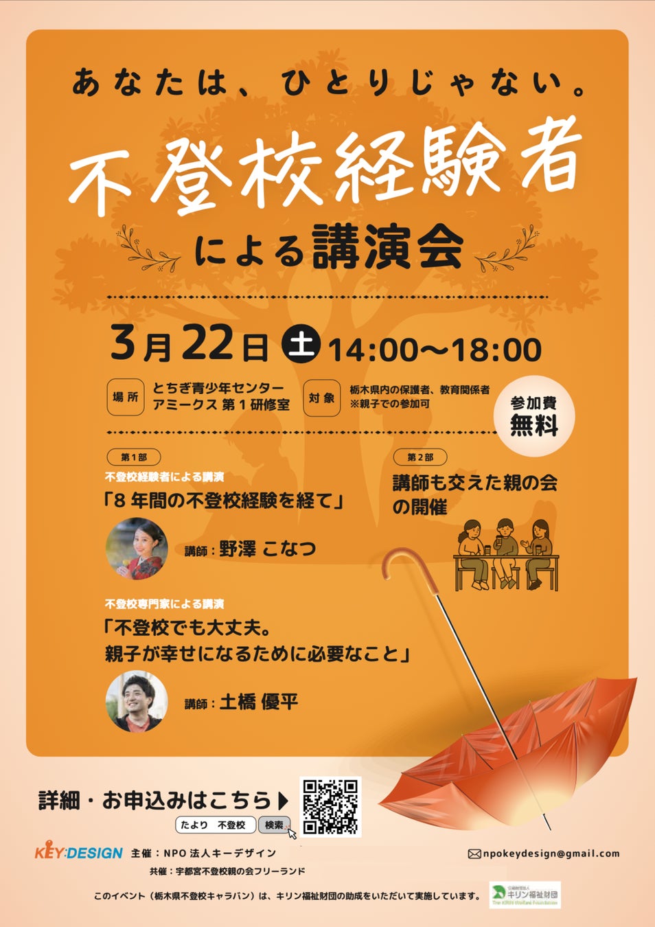 ※この講演会(栃木県不登校キャラバン)は、キリン福祉財団の助成を受けて実施しています。