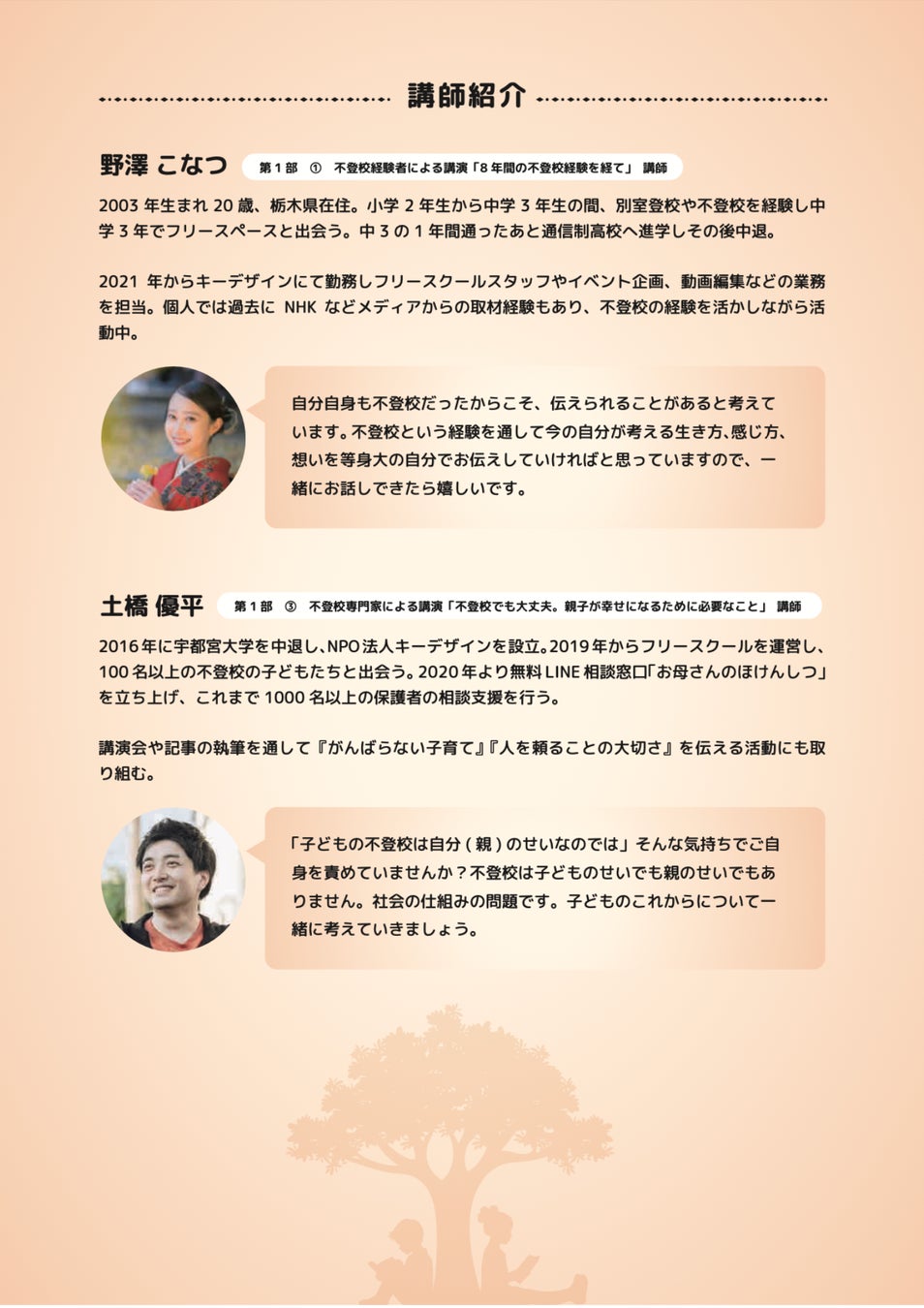 二部構成となっており、第一部は不登校経験者である野澤こなつさんによる講演と、これまで2,000人以上の保護者の相談支援を行ってきた不登校専門家である土橋優平さんによる講演となります。第二部は参加した保護者同士が話をできる場として親の会を実施します。