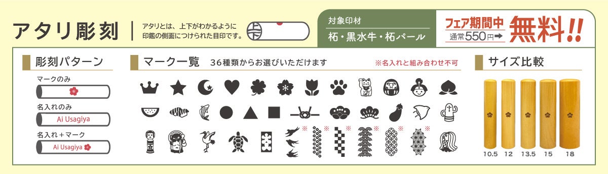 期間中通常550円(税込)かかるアタリ彫刻、イラスト印面が無料!