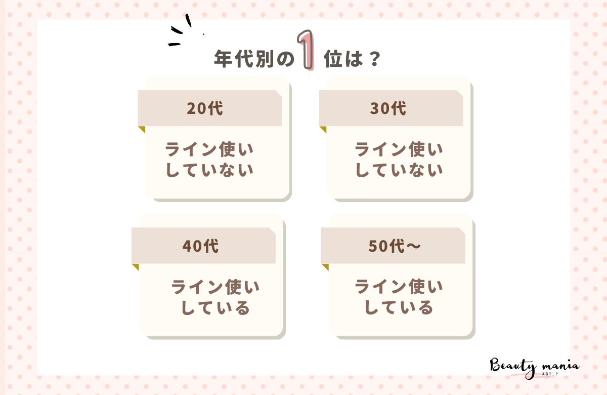ライン使いしない理由としては「好きなものをそれぞれ選んでいる」「特に決まったブランドがない」という意見が多く、お気に入りのものが決まっていない、色々試してみたい!という傾向は20代・30代の方の方が多い結果となりました。