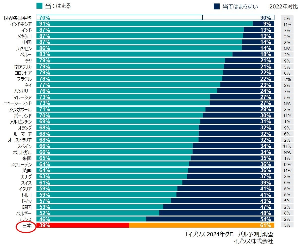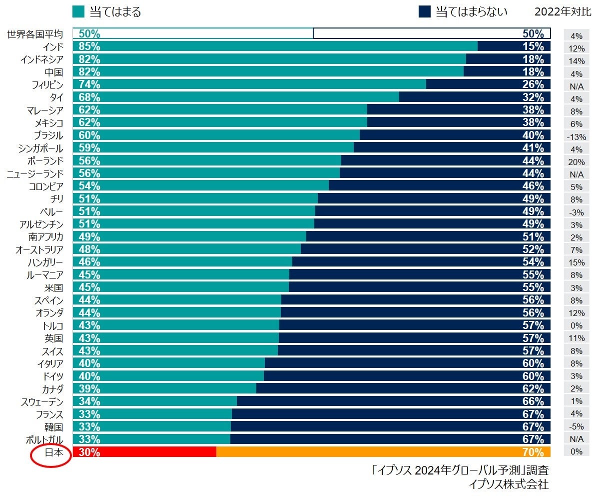 各国別にみると(下記グラフ参照)、日本は「2024年は2023年よりも自分にとって良い年になると楽観している」という設問に、「当てはまる」と答えた割合は39%。34カ国の中でもっとも期待度が低いものの、前回調査時より3%上昇しており、グローバルの結果と同様に、ややポジティブ傾向であることがうかがえます。