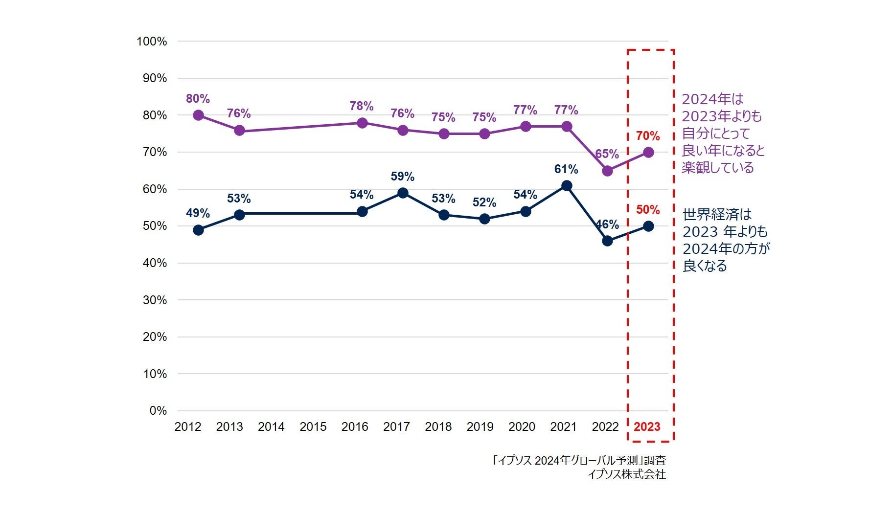 調査を始めた2012年からの水準には満たないものの、過去10年間で最低の数値を記録した2022年と比較すると、状況が好転しています。今年より来年は「自分にとって良い年になる」とする数値は5ポイント、「世界経済は良くなる」とする数値は4ポイント上昇しました。