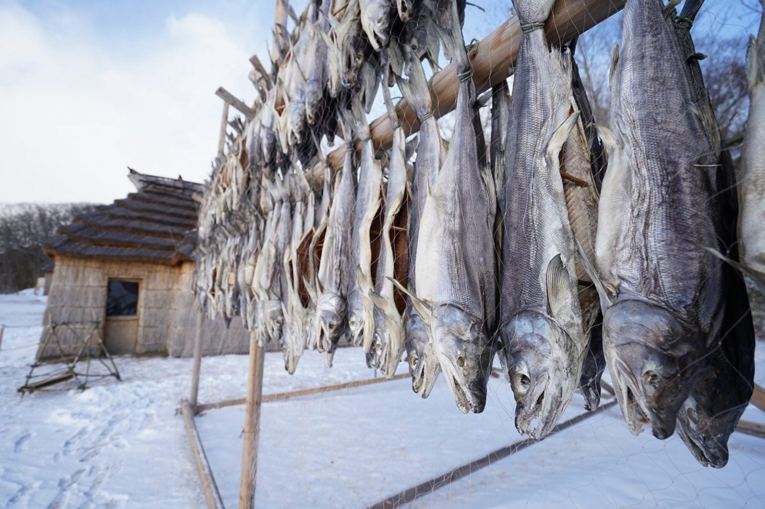 サッチェㇷ゚とは魚を乾燥させた保存食。屋外に吊るし干される魚は伝統的コタンの冬の風物詩。