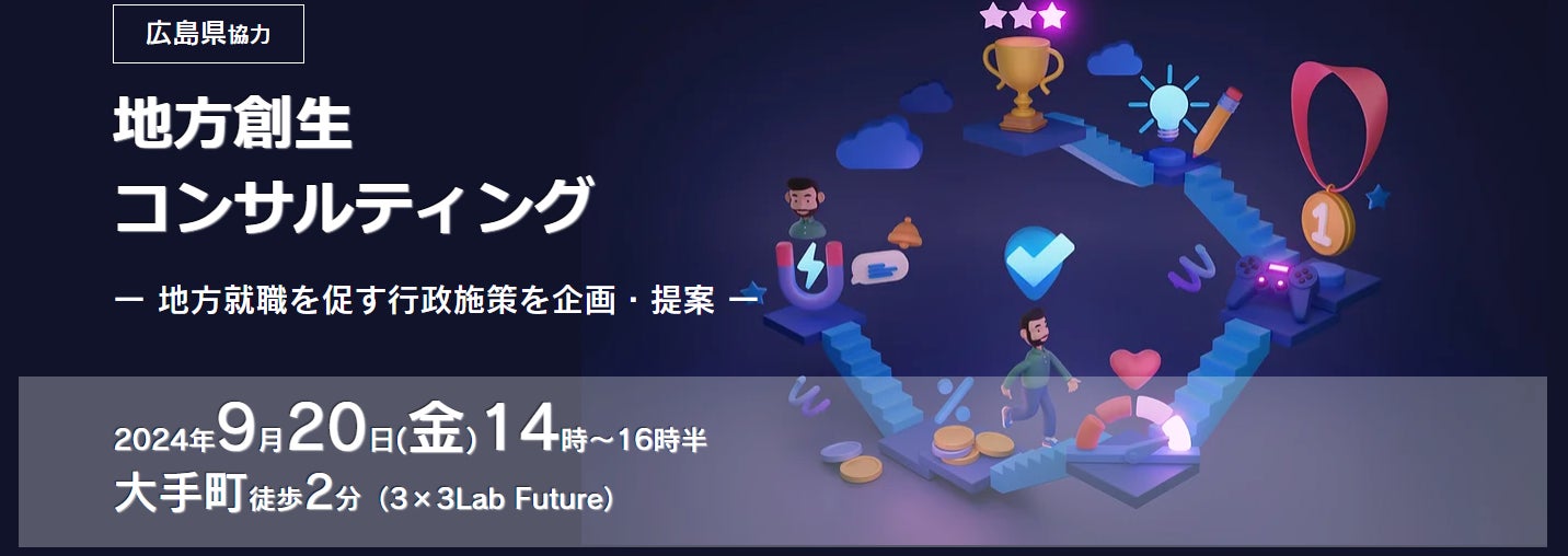 地方創生や県外就職に関心のある大学生を対象に、転出超過の約半数を就職や進学による20歳から24歳の若者の転出が占めており、若者減少・人手不足対策が喫緊の課題となっている「広島県」をケーススタディとして東京一極集中問題について考えます。【地方で働くこと、地方での生活】に対する解像度を上げることで新しい選択肢として地方への就職検討を促す、そんな新たなアプローチを目指します。イベントはリアル開催とオンラインの計2回開催し、広島県へのUIターン促進につなげます。