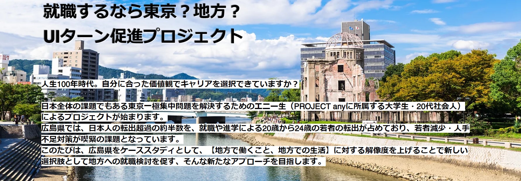2つのイベントは「20代から、世界を変える」をキャッチフレーズに20代の自己実現をサポートする共創型プラットフォームPROJECT anyをサービス展開する株式会社OVER20&Company.(東京都港区)と事業連携して実施します。イベントは同プラットフォームに登録する「エニー生」が主体となってプロジェクトチームを構成、大学生や20代の視点から地方創生について考えます。広島を拠点に活躍する経営者やビジネスリーダー、Iターン就職経験者との交流、パネルディスカッションやワークショップを通じた意見交換をします。