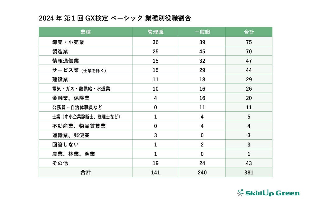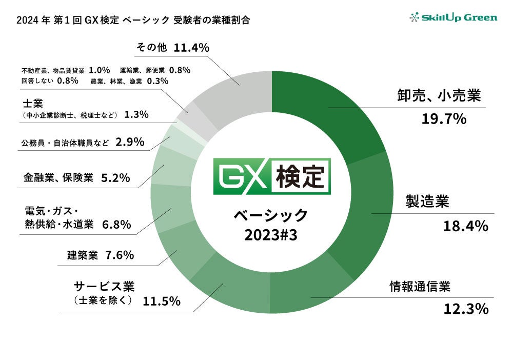 「2024年第1回GX検定 ベーシック」の受験者を業種別に見ると、上位から卸売、小売業 / 製造業 / 情報通信業 / サービス業(士業を除く)と続き、前回までと同じ顔ぶれとなりました。